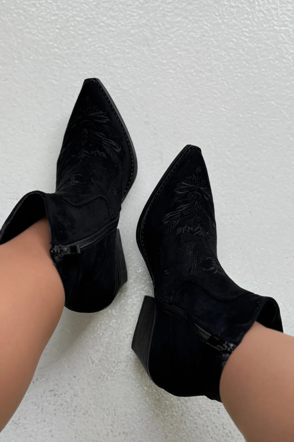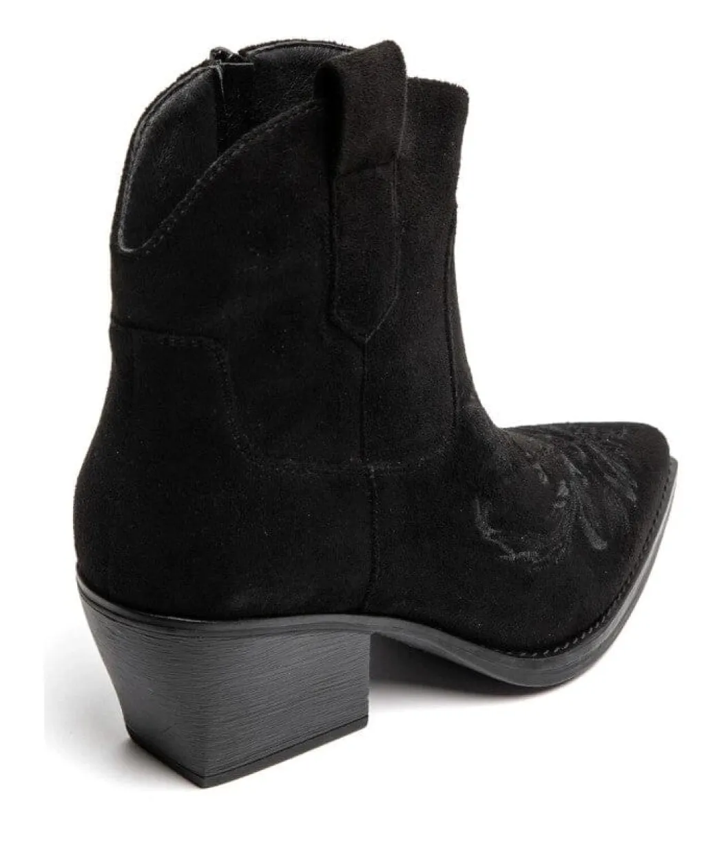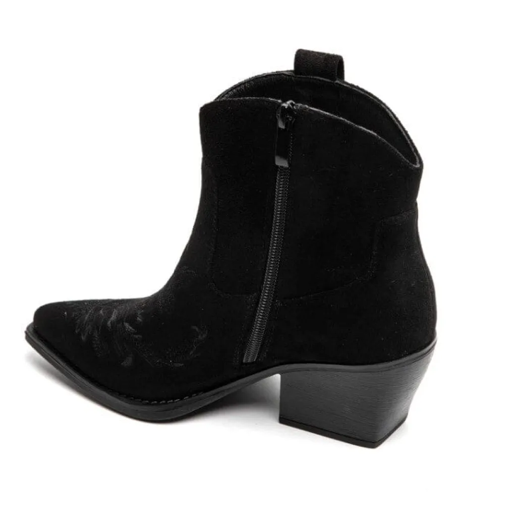 Sort støvle fra Bloom med broderet mønster og spids tå. Støvlen har en block heel og lynlås i siden.