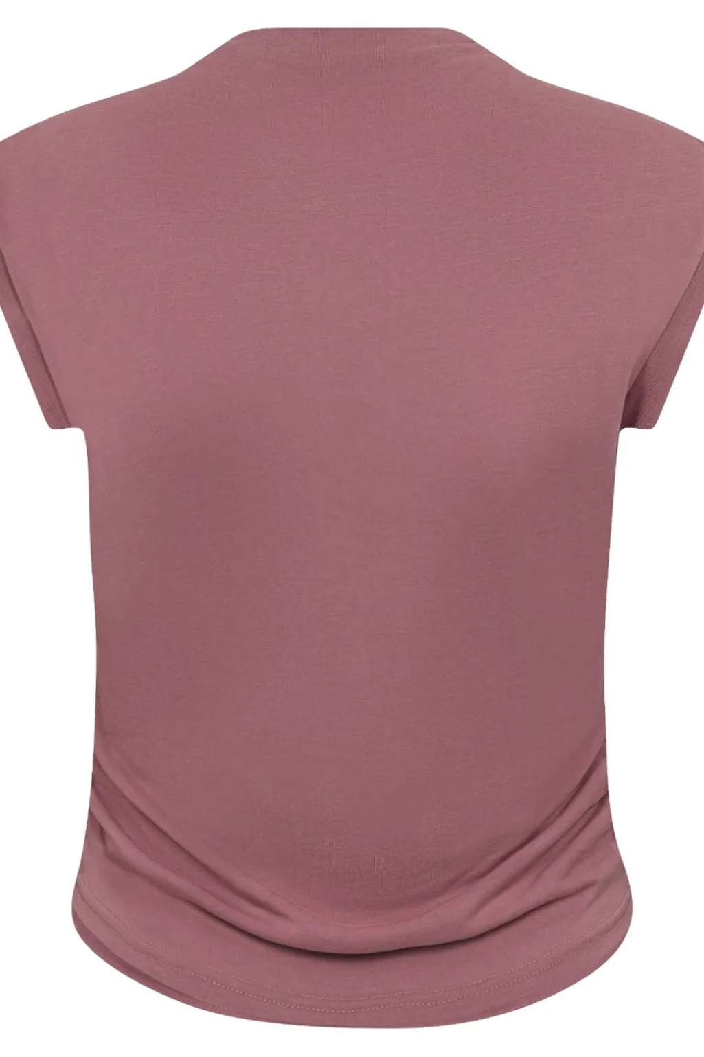 T-shirt fra Co’Couture i en rosenrød nuance. Den har rund halsudskæring og korte cap-ærmer. Materialet er en blød blanding af modal og polyester med et let fald.