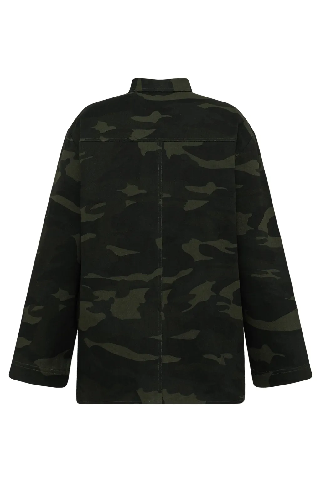Camojakke fra A-View, lavet af 100% bomuld i armygrøn og sort. Jakken har et camouflage-mønster med funktionelle detaljer.