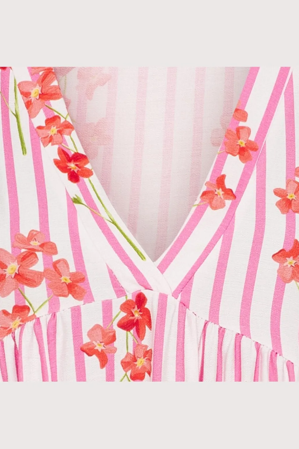 Knælang kjole fra Marta Du Chateau med lyserøde striber og røde blomster. Kjolen har flæsekanter og en V-halsudskæring, der giver et feminint udtryk.