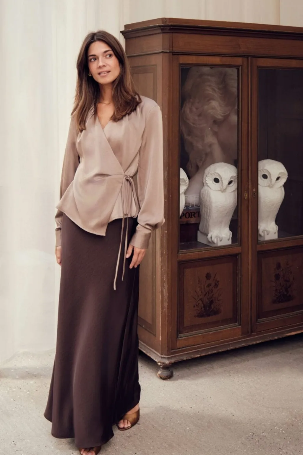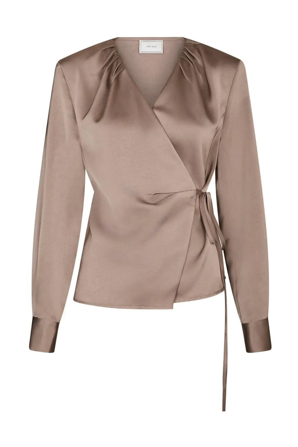 Satinbluse fra Neo Noir i mørk taupe. Blusen har en løs pasform med slå-om-design og bindebånd i siden.