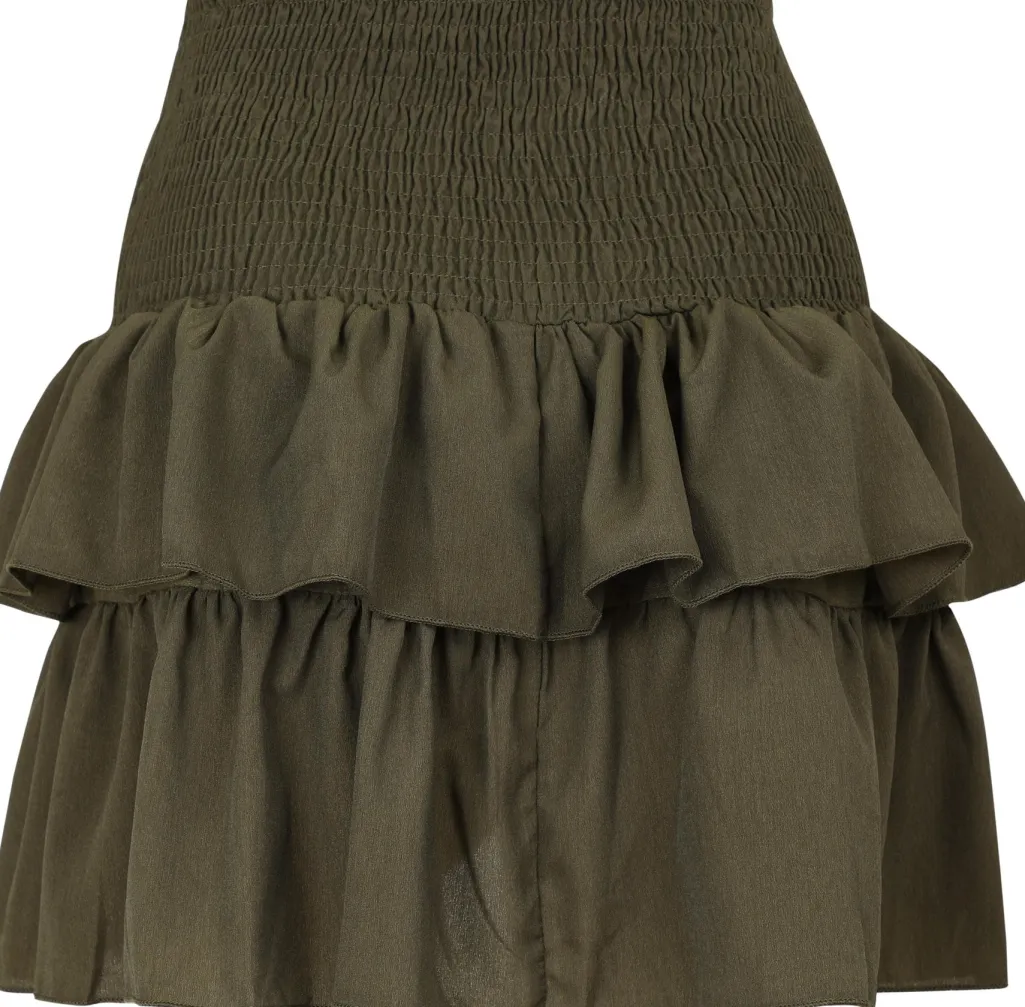 Nederdel fra Neo Noir i armygrøn. Fremstillet af genanvendt polyester med smock-talje og to lag flæser. Den høje talje og de bløde folder skaber en fin silhuet.