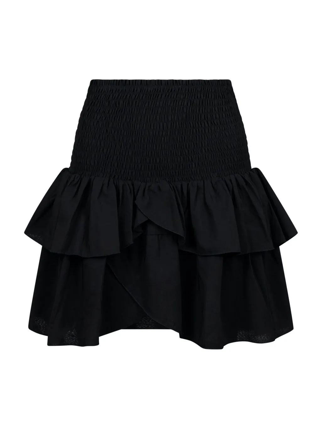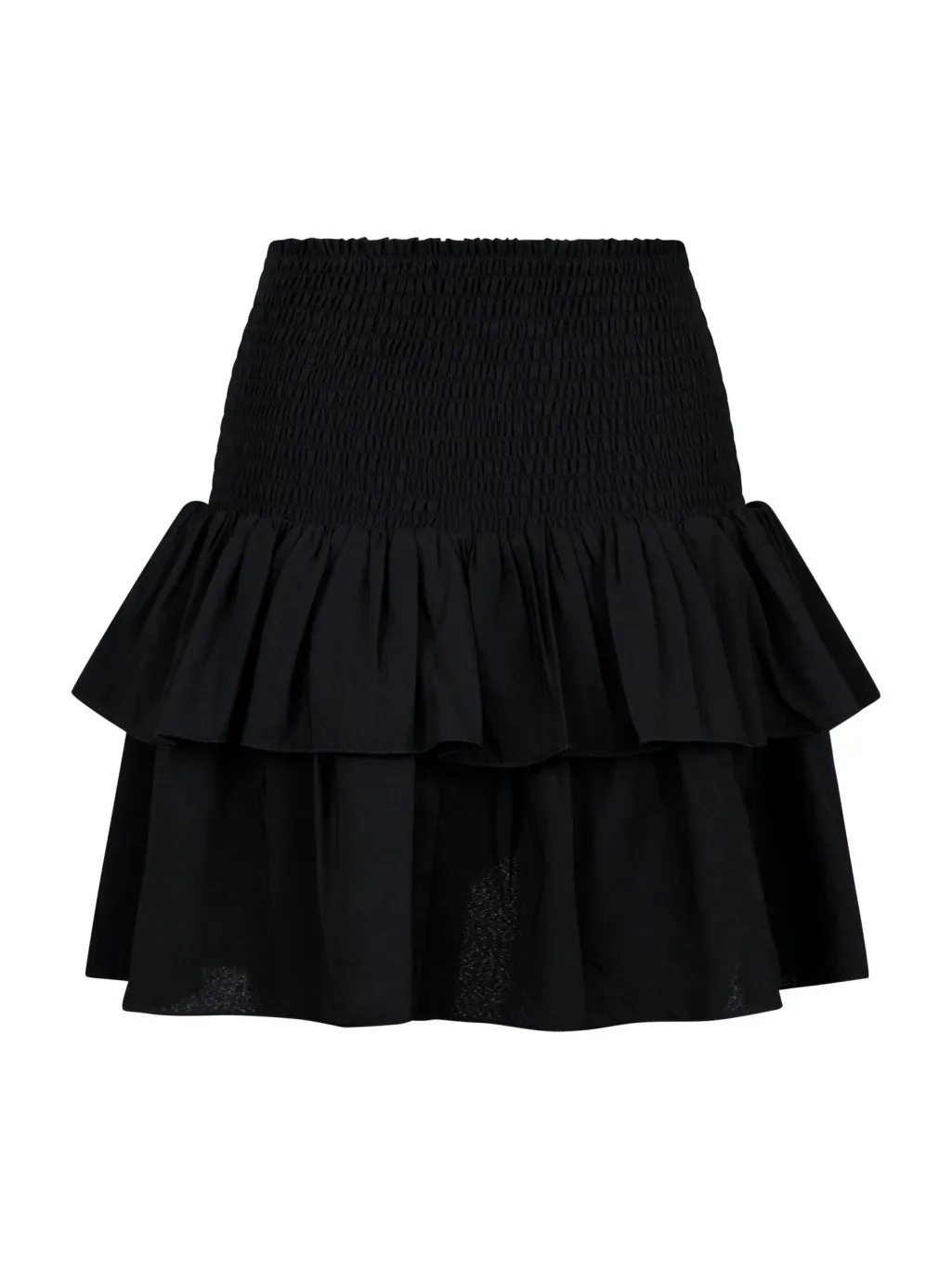 Sort nederdel med to-lags flæser og slids foran. Den høje talje har smock-detaljer og elastik, der giver god bevægelse. Fremstillet af genanvendt polyester.