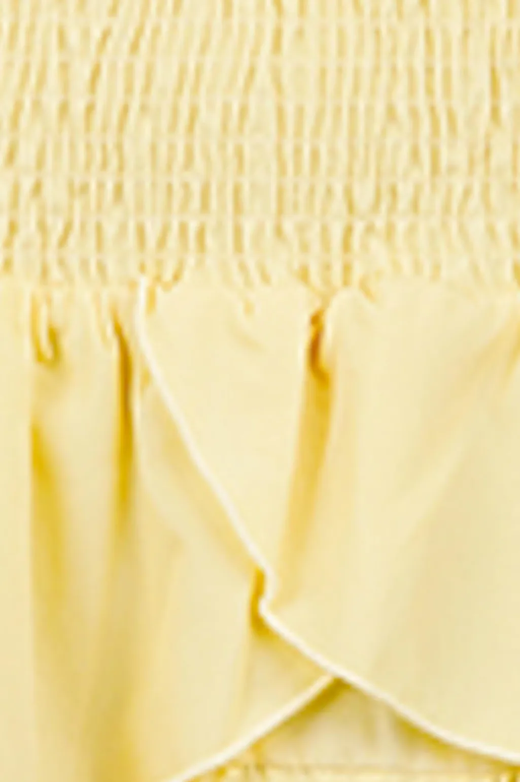 Gul nederdel fra Neo Noir med to-lags flæser og smock-talje. Nederdelen er lavet af genanvendt polyester med en høj talje og elastisk lukning.