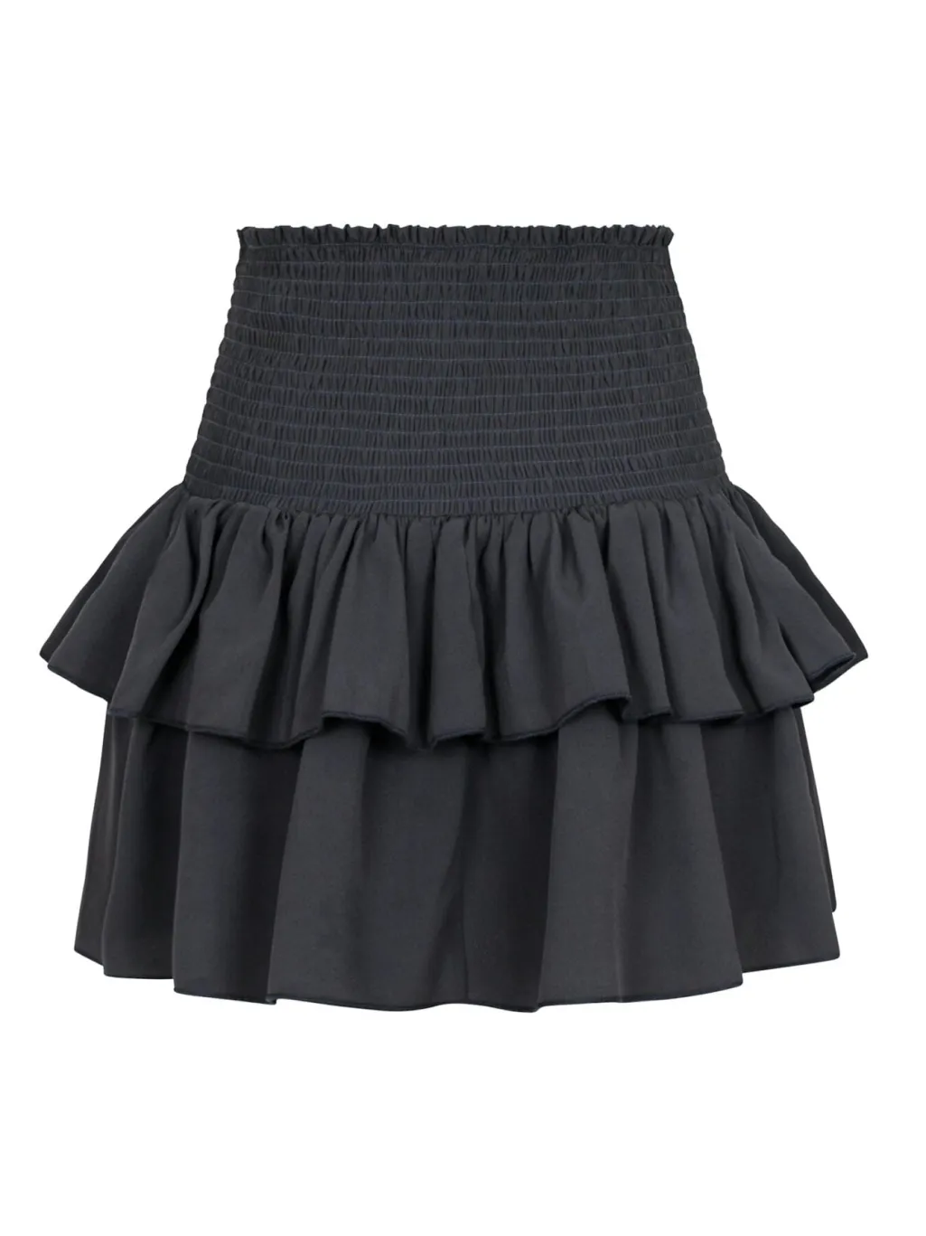 Kort nederdel fra Neo Noir i antracitgrå. Den har to lag flæser og dekorative syninger. Taljen er designet med smock og elastik, som giver en god pasform.