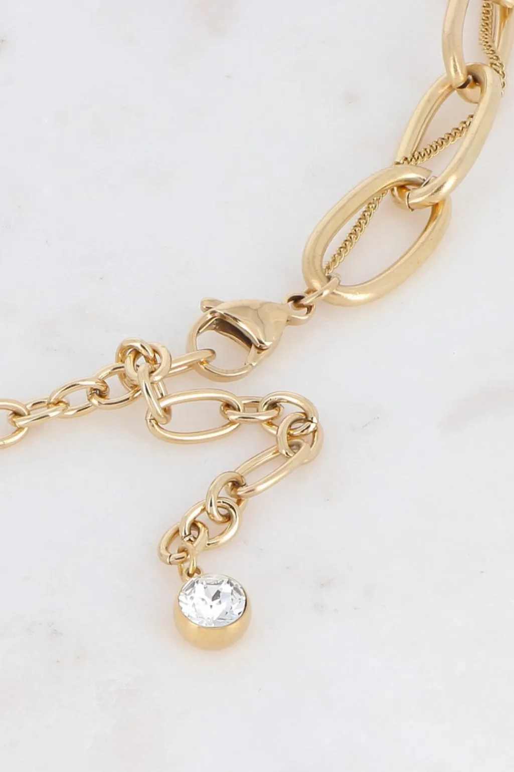 Forgyldt halskæde fra Mellow Moon med store kædelænker og en rund krystalpendant. Halskæden er lavet af rustfrit stål med en gylden finish.