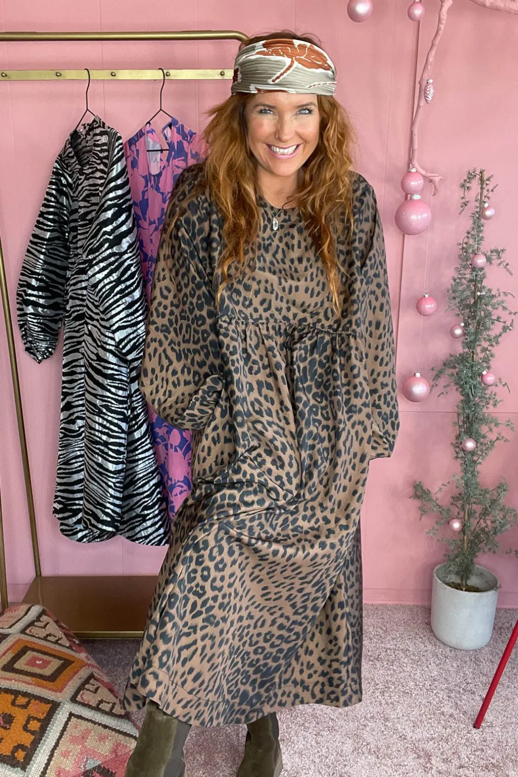 Midi-kjole fra Valentin Studio i leopardmønster. Den løse silhuet med samlet talje og lange ærmer giver en praktisk og alsidig kjole til både hverdag og fest.