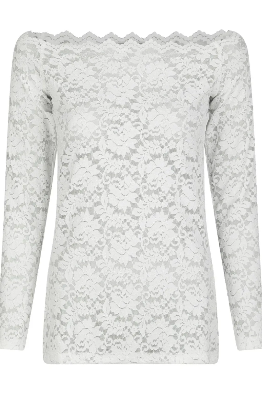 Hvid blondebluse fra Neo Noir med off-shoulder-design. Blusen har en bølget blondekant ved halsudskæringen og lange ærmer med blomstermønster i blonden.