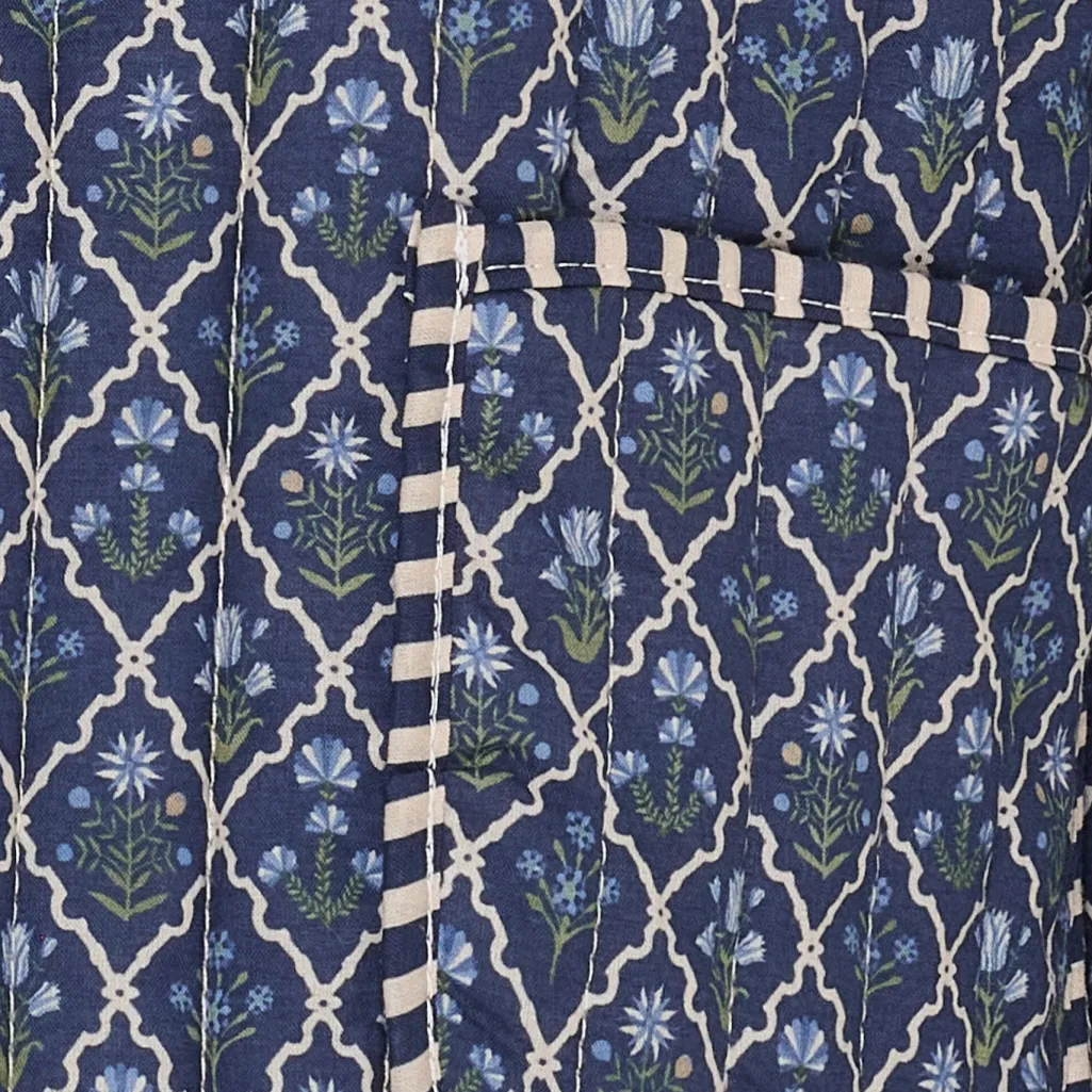 Mørkeblå jakke fra Marta Du Chateau med rudemønster og dekorative syninger. Den har rund halsudskæring, knaplukning foran og to praktiske forlommer med kontrastmønster.