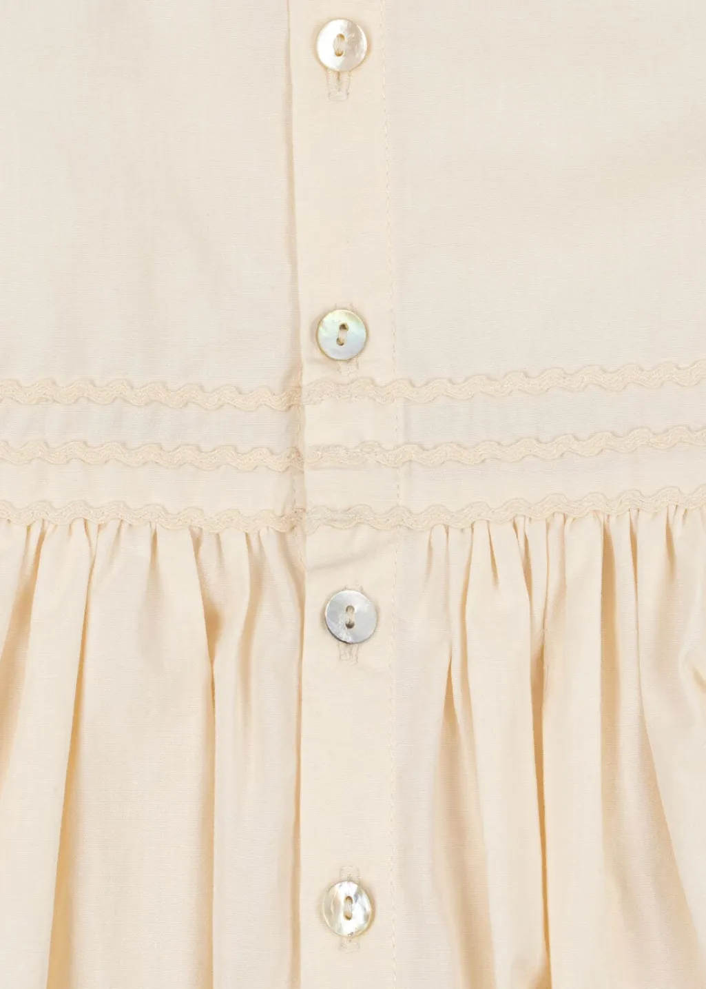 Et festsæt i lys eggnog-farve fra Konges Sløjd med kjole og bloomers. Sættet har fine flæser ved skuldrene, blonder og broderede detaljer.