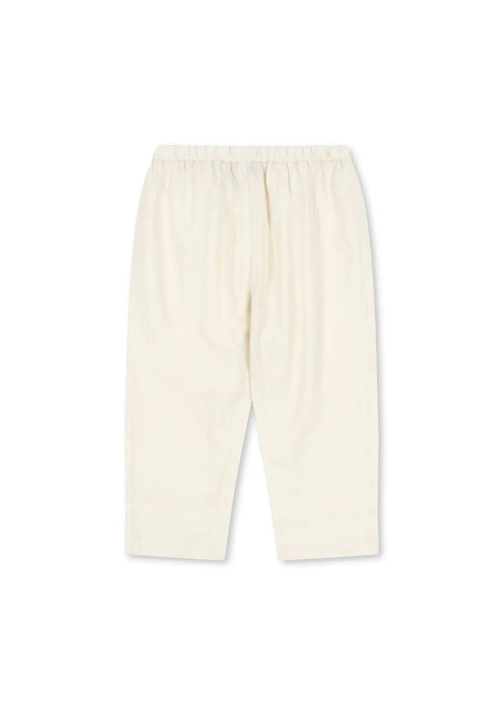 Bukser fra Konges Sløjd i en lys, neutral eggnog-farve. Bukserne har elastisk talje, plisseringer foran og dekorative syninger, der går til midt på læggen.