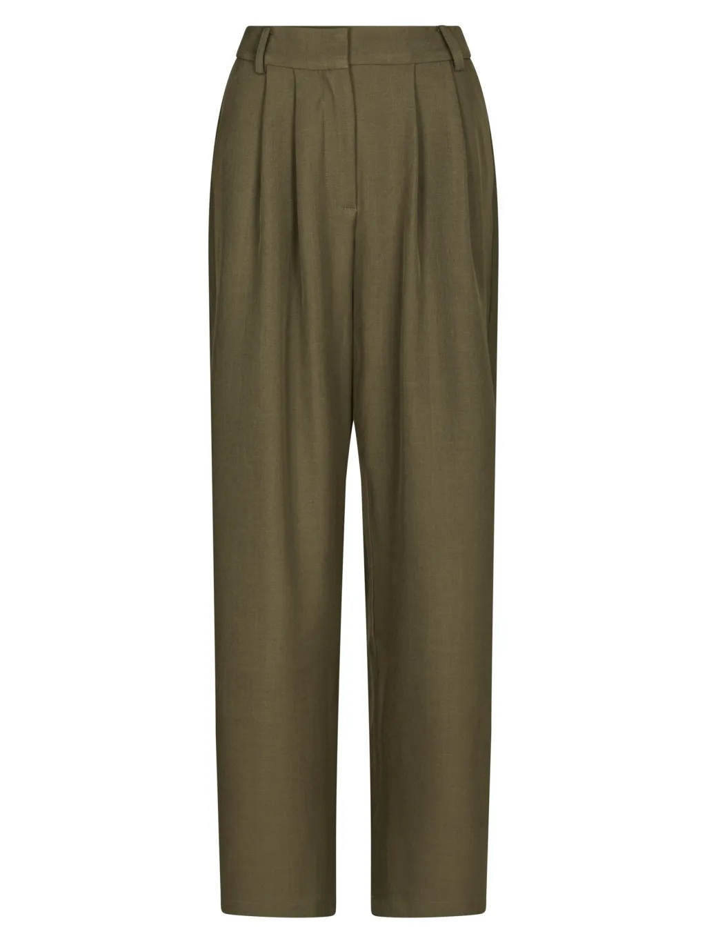 Khakifarvede bukser fra Molly&My x Julie Elgaard med brede ben og en struktureret pasform. Bukserne har en høj talje og en gulvlang længde.
