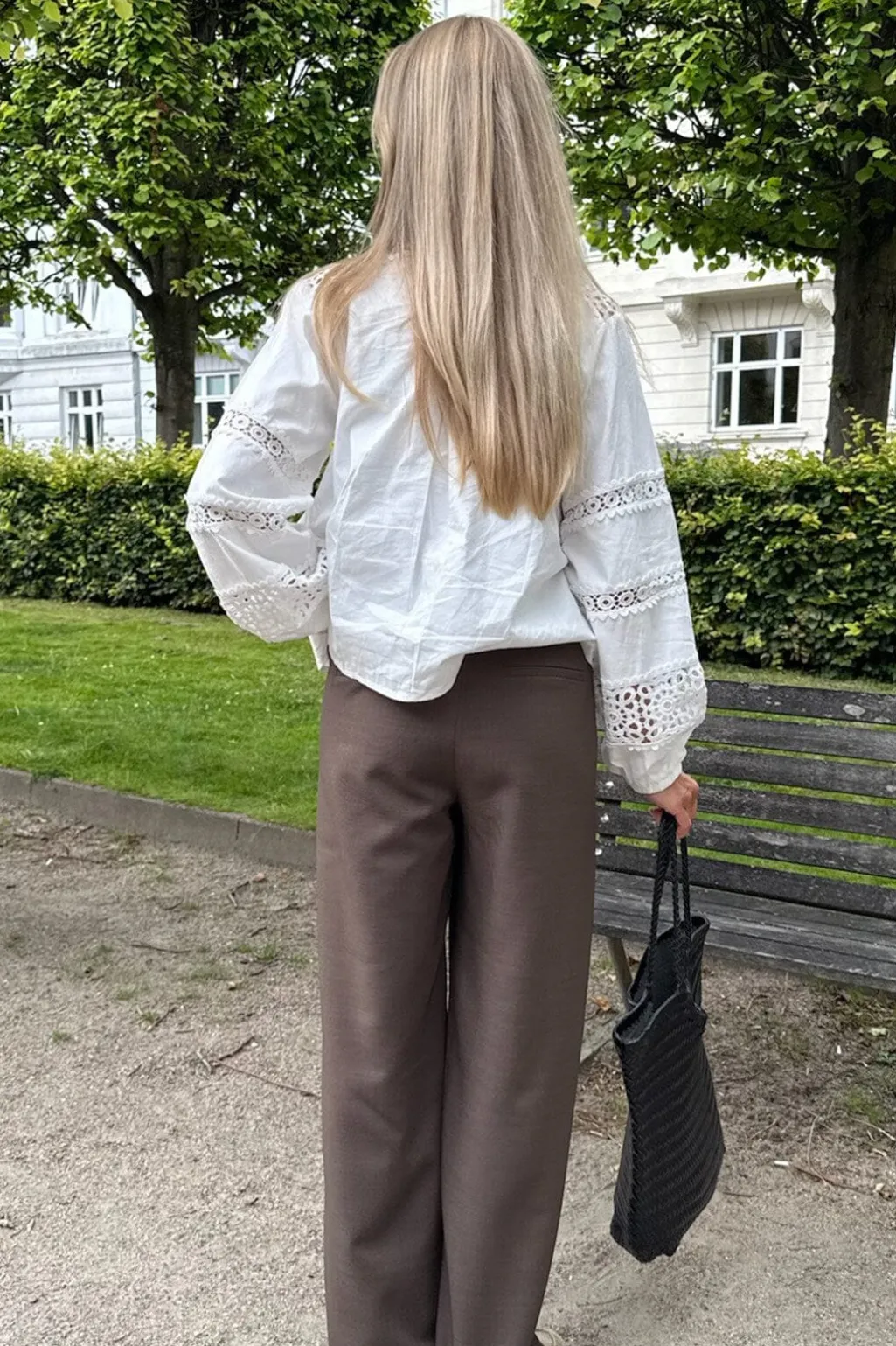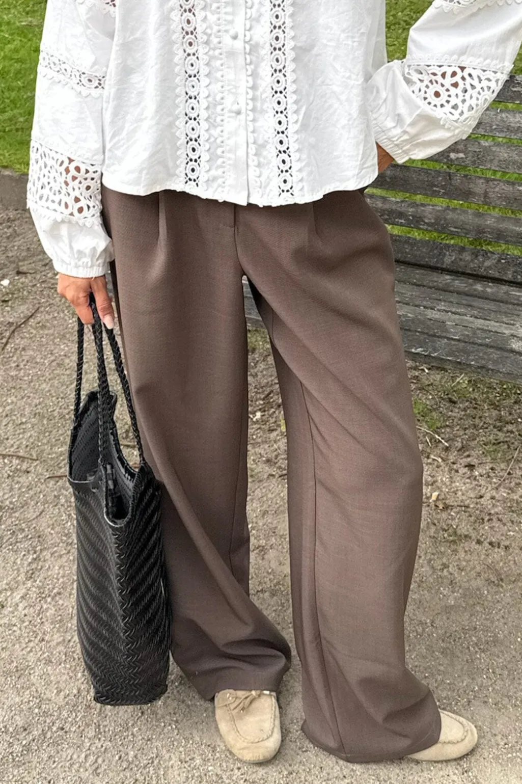 Mørkebrune bukser fra BYIC med høj talje og løs pasform. Bukserne har gulvlængde og er fremstillet i et blødt materiale med en bred, skræddersyet pasform.