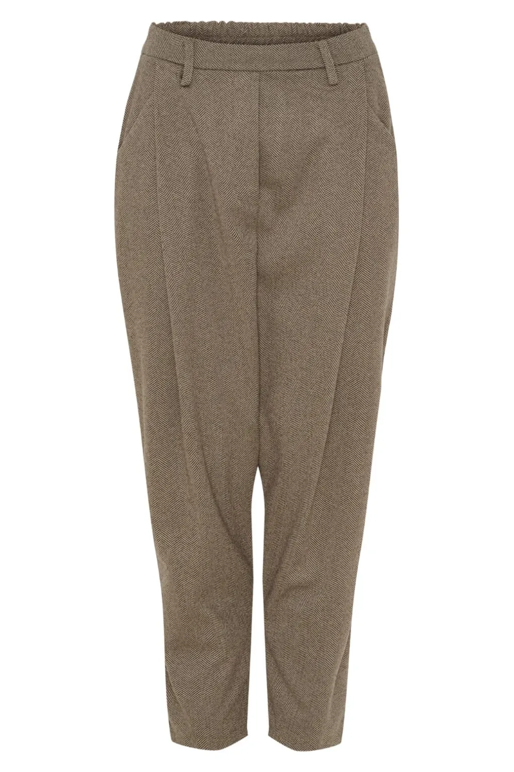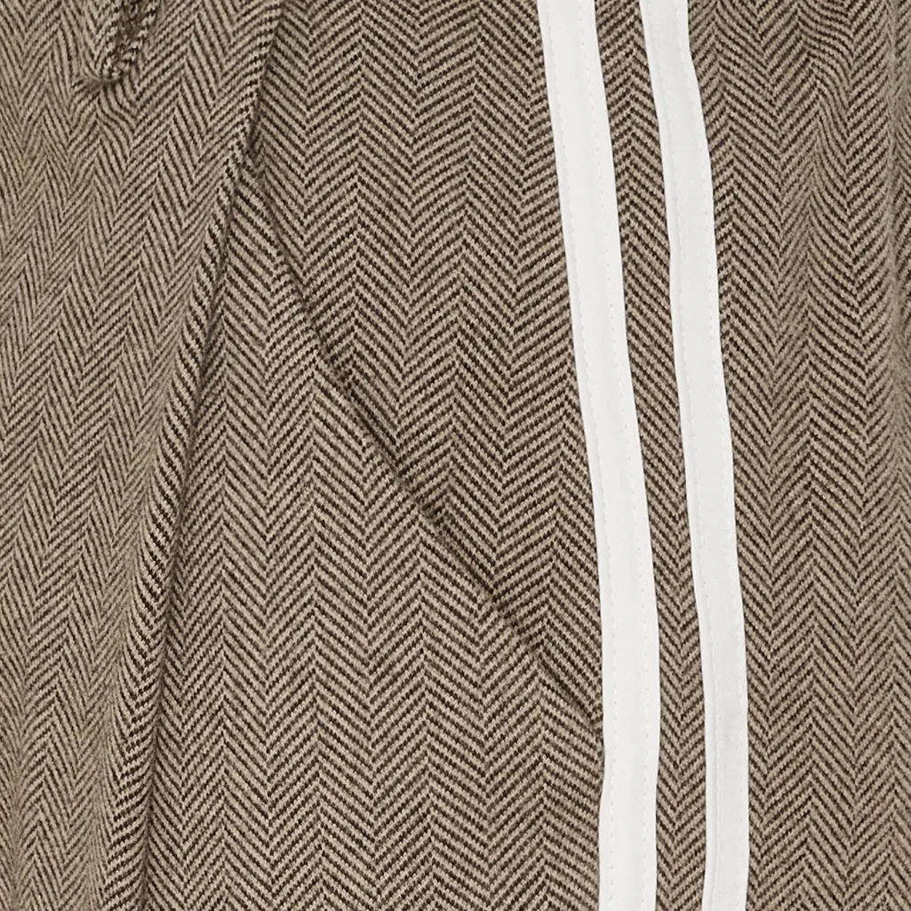 Brune bukser fra Marta Du Chateau med hvide striber langs benene. Bukserne har en løs pasform og går til midt på læggen. De har både lynlås, elastik og knapper i taljen.