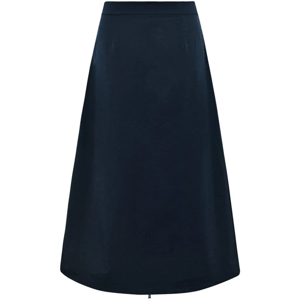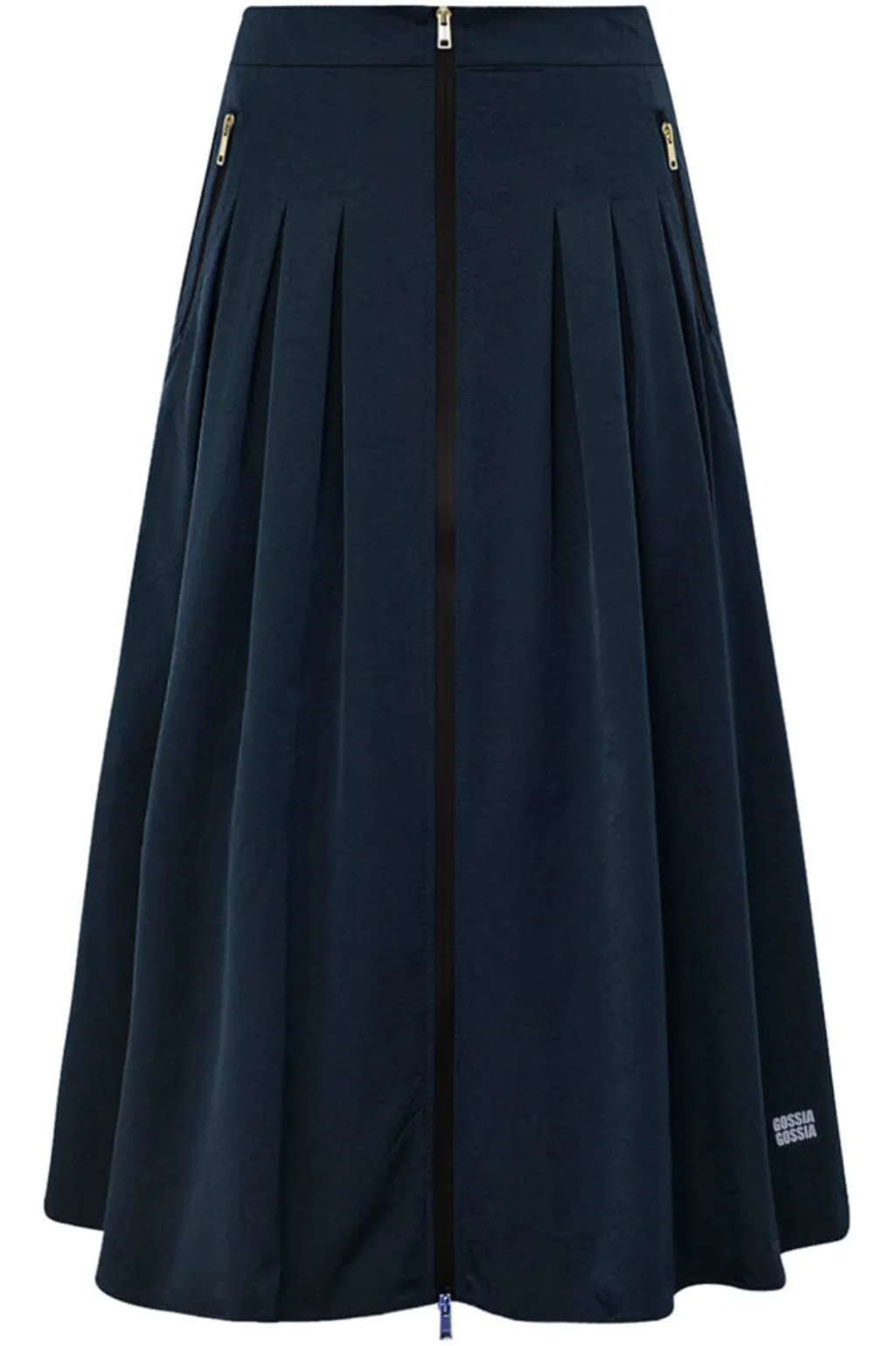 Mørkeblå nederdel fra Gossia med en lang længde og en synlig lynlås foran. Nederdelen har folder og en A-formet silhuet.