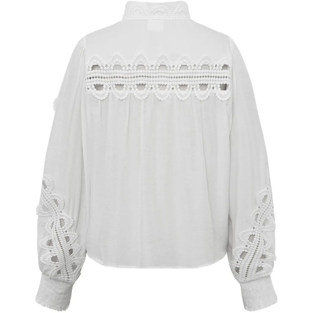 Off-white bluse fra Gossia med høj hals og blondedetaljer. Den løse pasform og de lange ærmer med elastiske manchetter giver god bevægelsesfrihed.