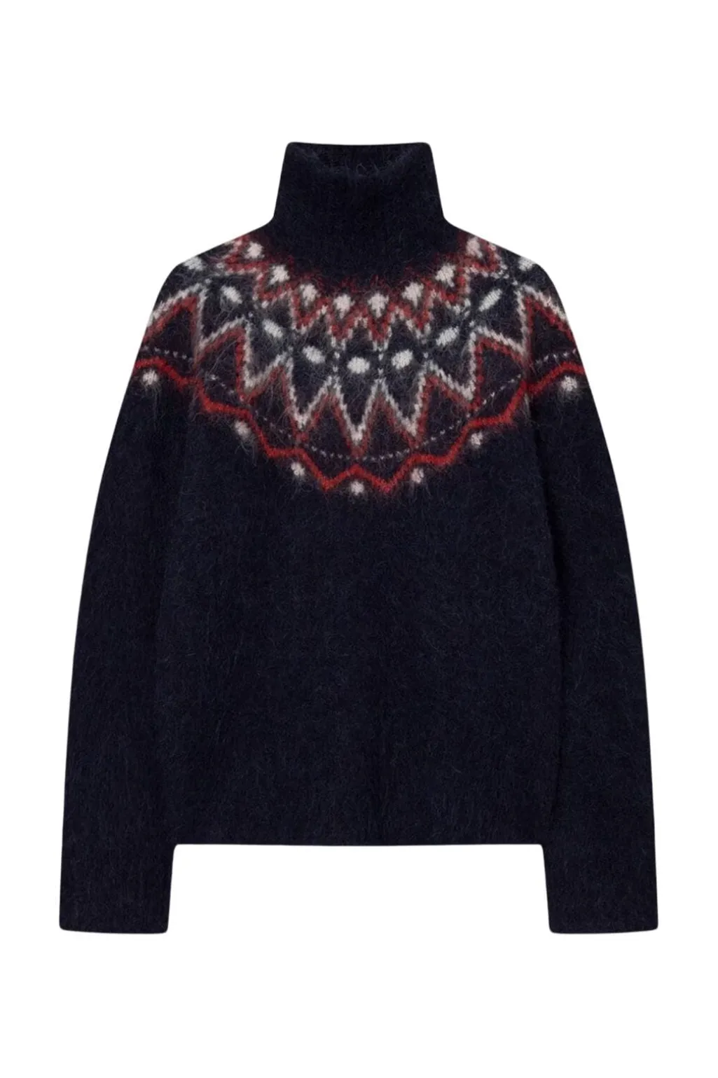Mørkeblå striktrøje fra Twist & Tango med et farverigt zigzag-mønster på brystet. Trøjen har en høj hals og lange ærmer.