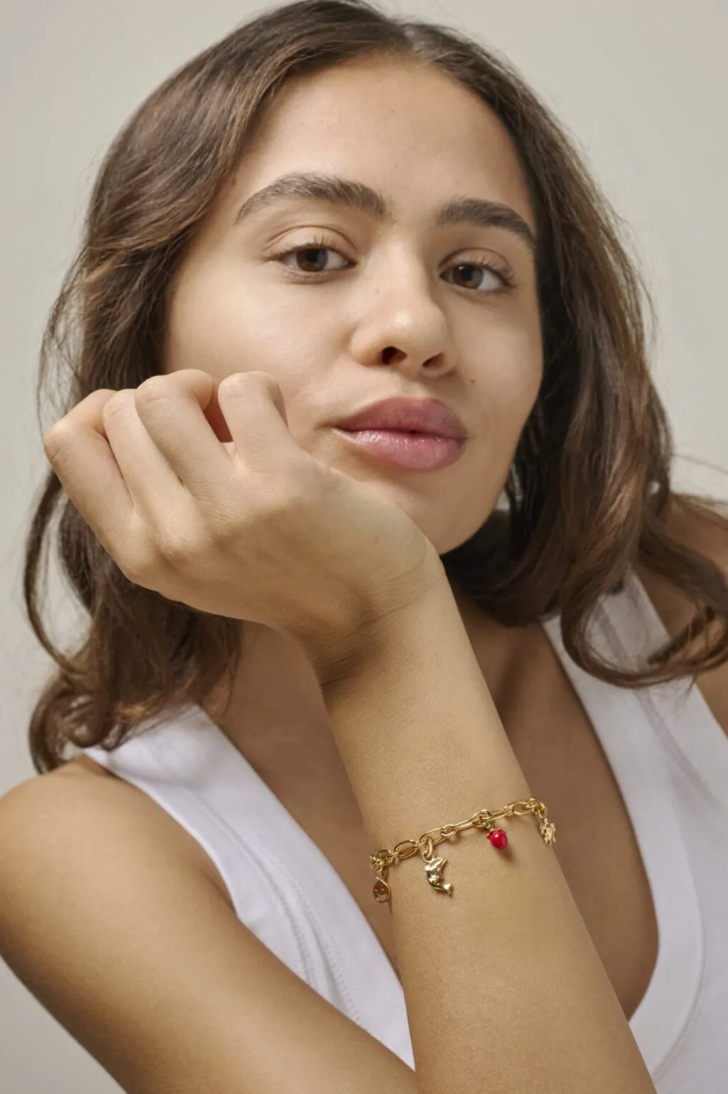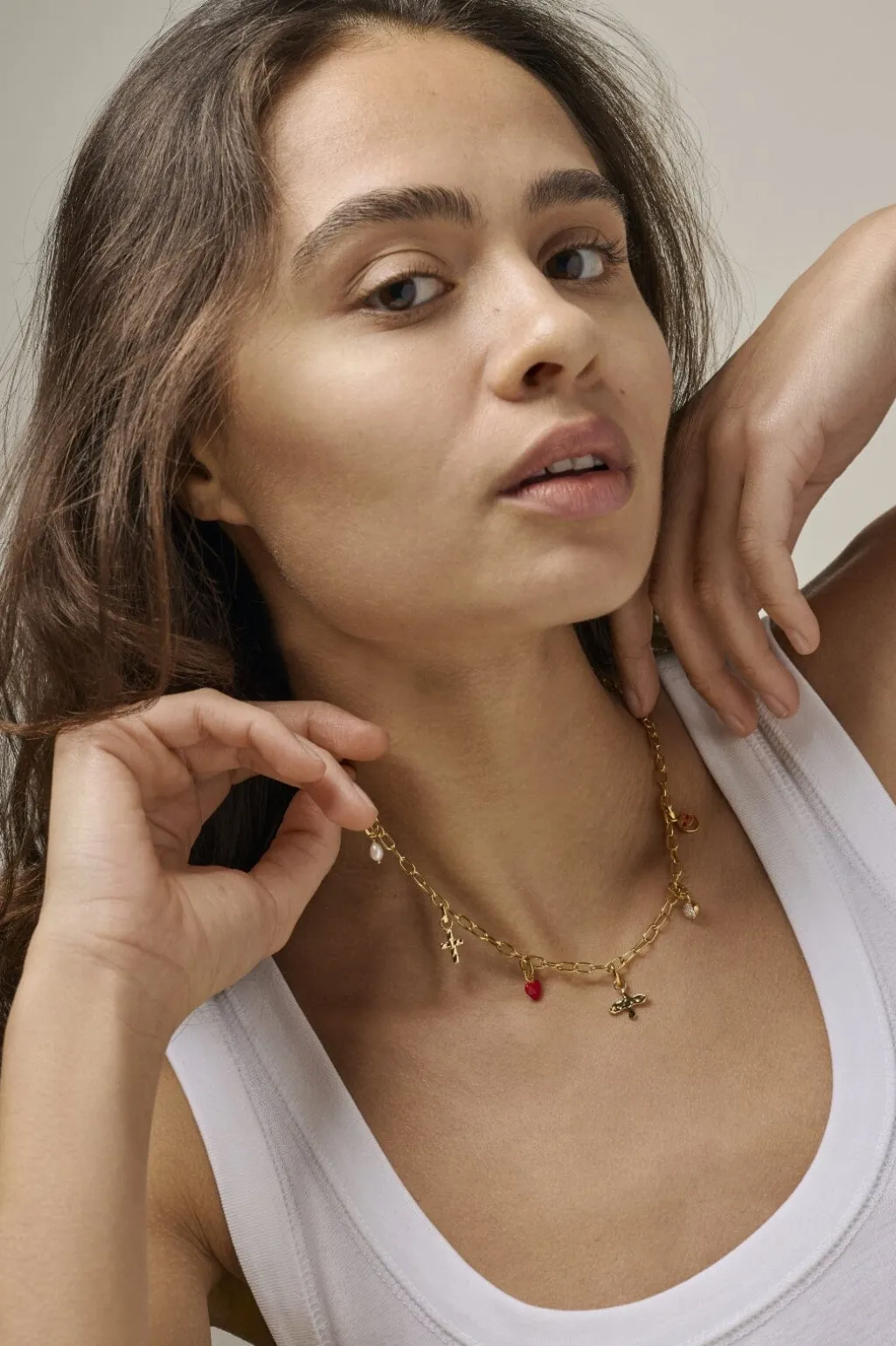 Guldbelagt charm fra Enamel Copenhagen med et smilende ansigt og røde hjerteøjne i emalje. Charmen kan bruges på både armbånd, halskæder og hoops fra Charm-serien.