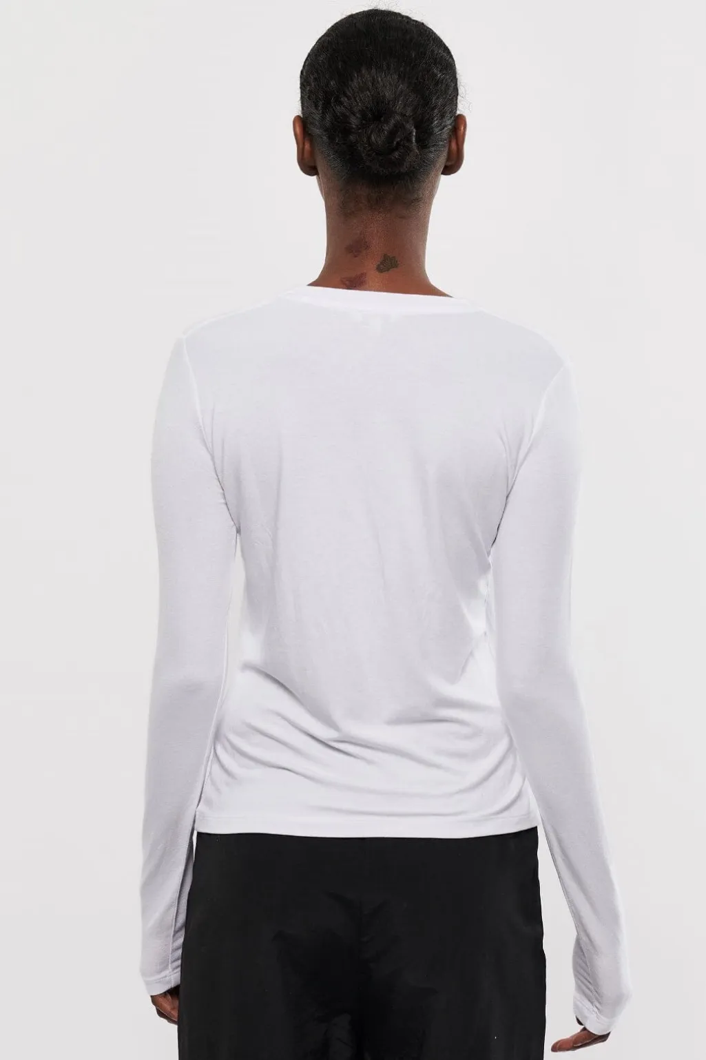 Hvid bluse fra MbyM i blødt TENCEL™ Modal med lange ærmer og rund hals. Den tætsiddende pasform og det strækbare materiale gør den velegnet til både sport og hverdag.