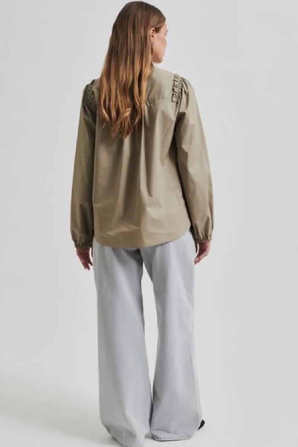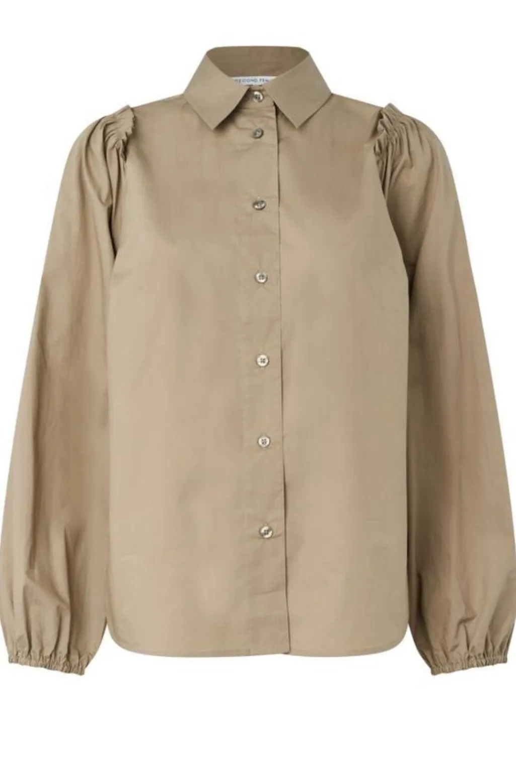 Skjorte fra Second Female i farven Fallen Rock. Den er fremstillet i økologisk bomuld med pufærmer og rynkdetaljer ved skuldrene. Skjorten har klassisk krave og knaplukning foran.