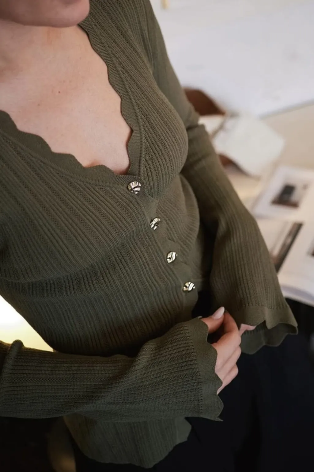 Strikket bluse fra Neo Noir i olivengrøn. Den ribbede bluse har flared ærmer med bølget kant og dekorative syninger gennem hele designet.
