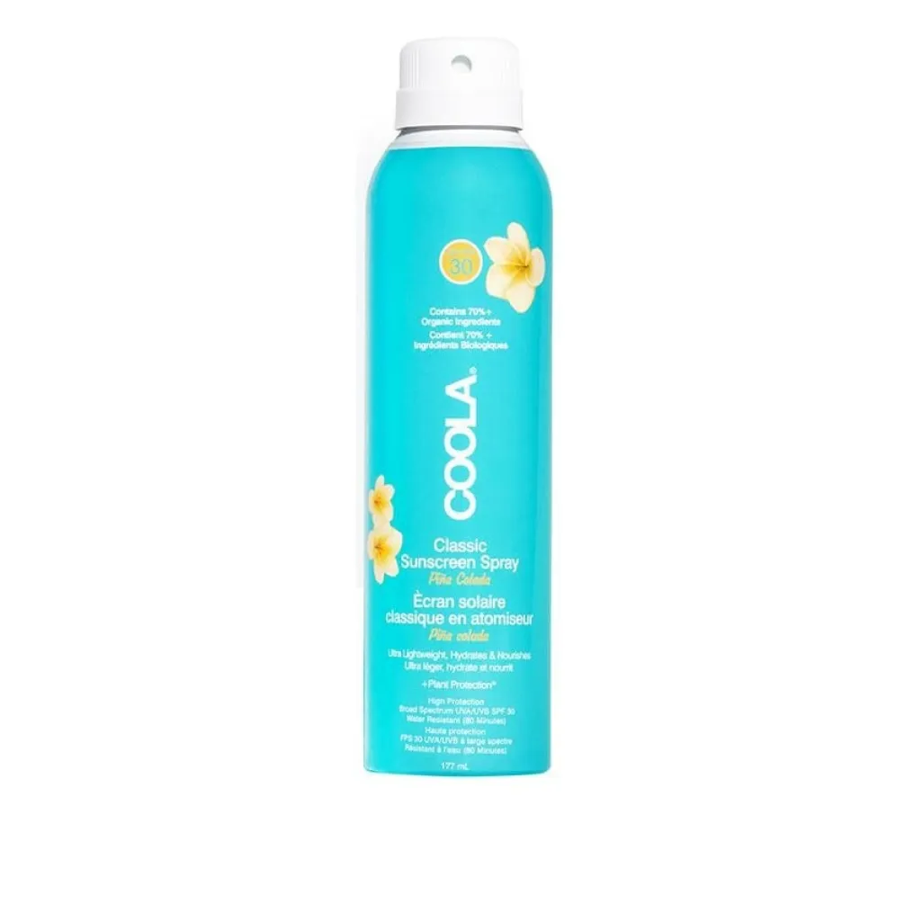 Økologisk solspray med SPF 30 til kroppen. Sprayen giver bredspektret UVA/UVB-beskyttelse og har en let duft af Piña Colada.