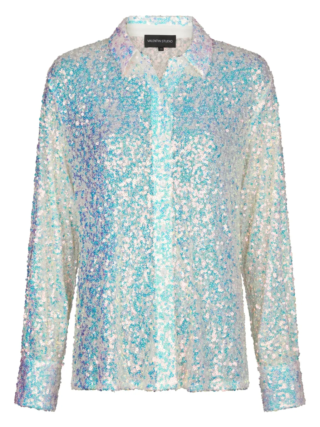 Skjorte fra Valentin Studio i offwhite med skinnende paljetter i forskellige farver. Den har en klassisk skjortekrave og knapper hele vejen ned.