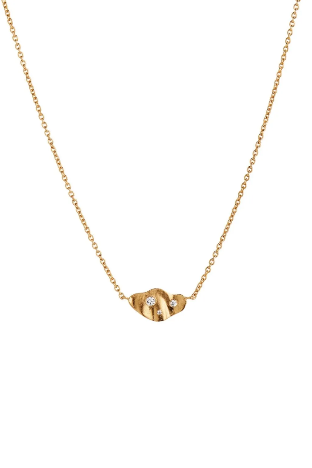 Guldfarvet halskæde fra Stine A med en fin kæde og vedhæng. De to hvide zirkoner i vedhænget skaber et diskret og dekorativt udtryk på den tynde kæde.