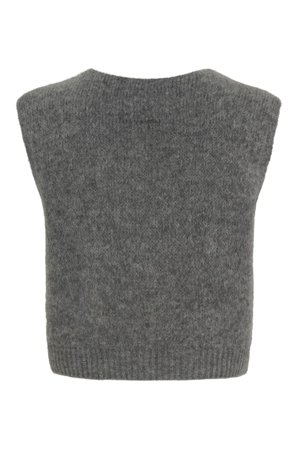 Grå vest fra Marta Du Chateau med V-hals og ribkant ved bunden. Vesten har en blød overflade og en klassisk pasform.