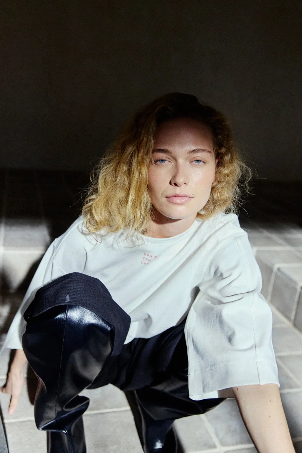 En hvid T-shirt fra Copenhagen Muse med oversize pasform og trekvartlange ærmer. T-shirten har print på både for- og bagside.