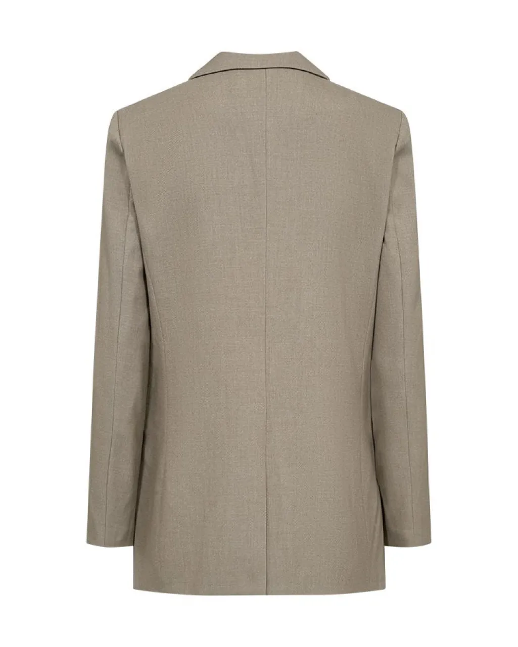 Skræddersyet blazer fra Copenhagen Muse i en beige-grøn meleret farve. Jakken har brede skuldre, V-udskæring med revers og en logomønstret foering. Den passer til både formelle, afslappede og festlige lejligheder.