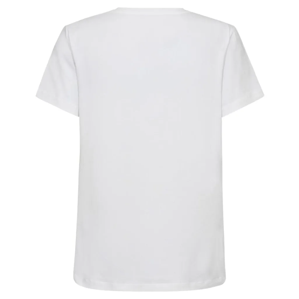 Hvid t-shirt fra Co’Couture med guldfarvet folieprint på forsiden. T-shirten har rund halsudskæring og korte ærmer med dekorative syninger.