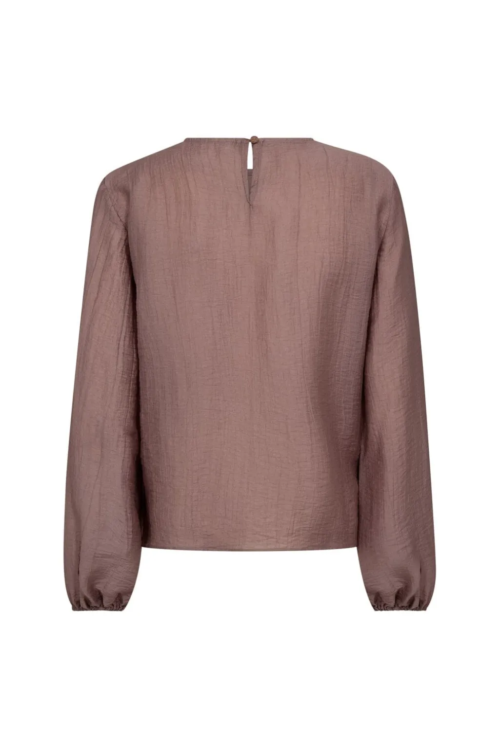 Bluse fra Co´Couture i gammelrosa med et draperet design på forsiden. Blusen har lange ærmer med elastik ved håndleddene og en keyhole-åbning bagpå.