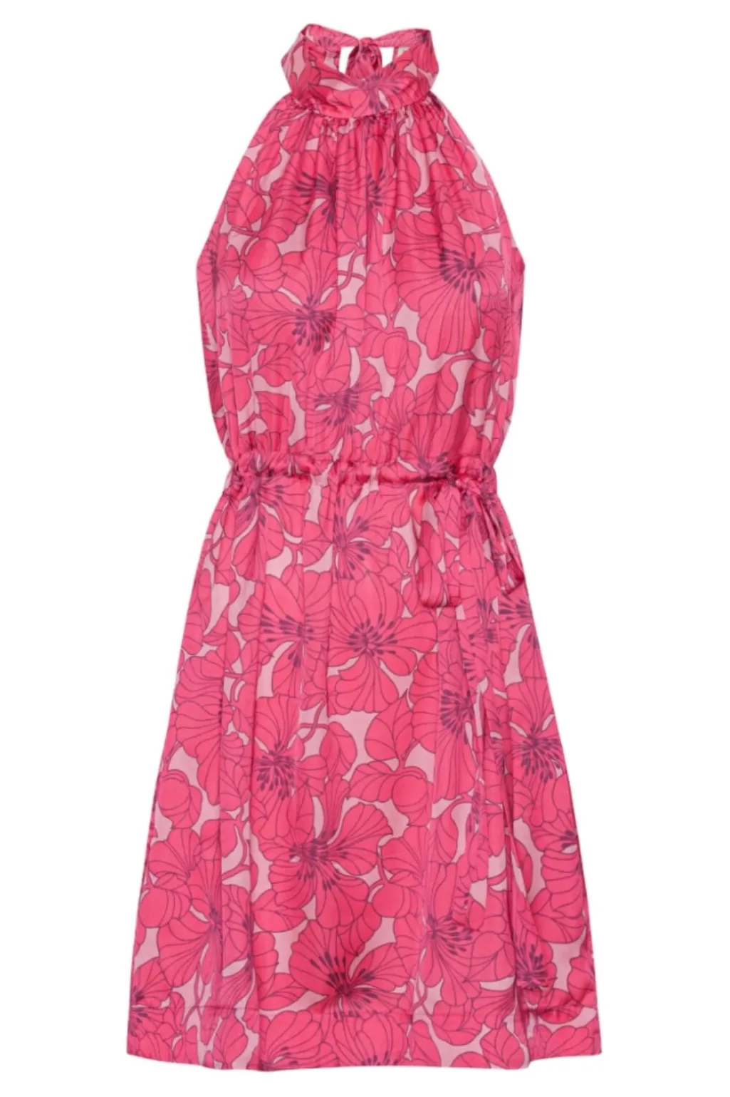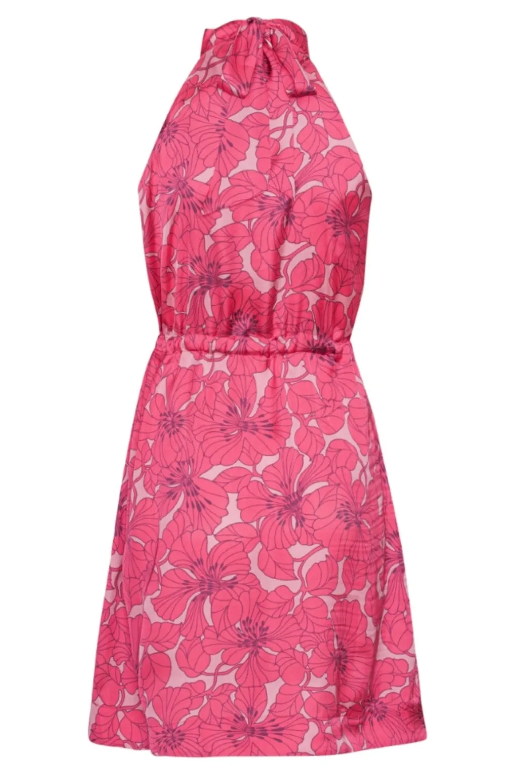 Smuk knæ-lang kjole med integreret bælte fra Karmamia. Kjolen har en elegant høj halter-neck, som bindes bagpå.