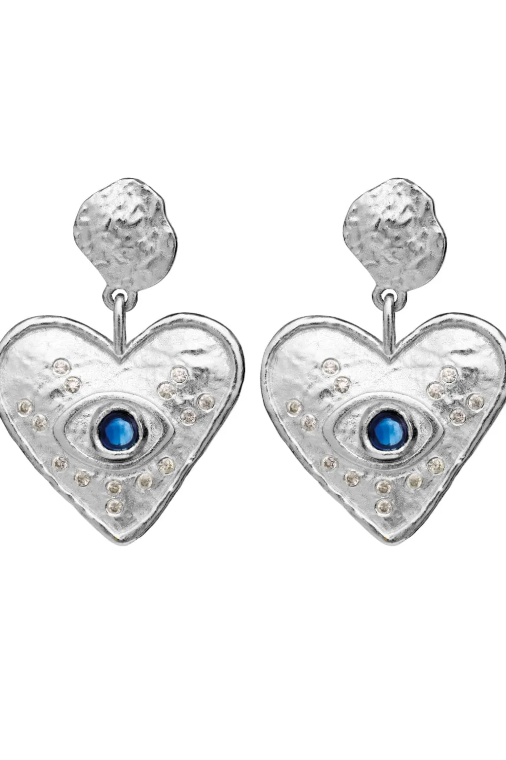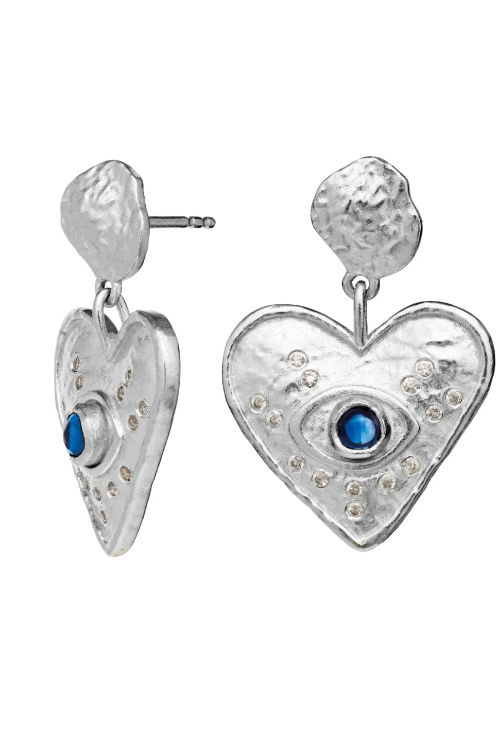 Sølvøreringe fra Maanesten med hjerteformet design og blå sten i midten. Øreringene har et dekorativt øjemotiv og er pyntet med små, klare sten rundt om den blå centersten.