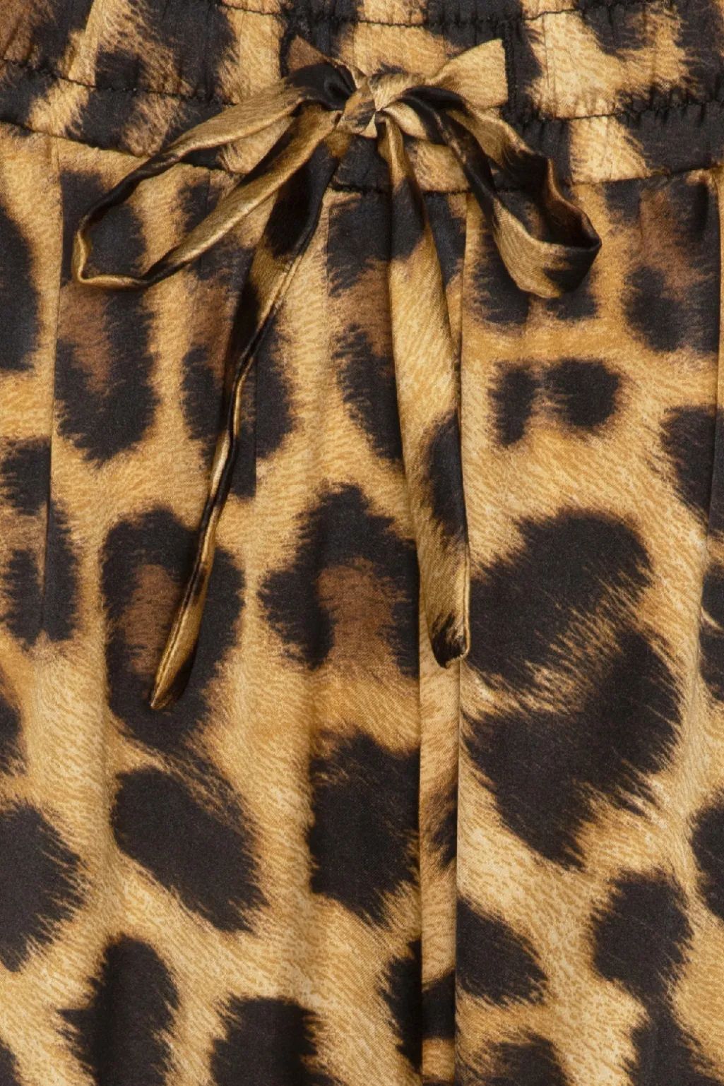 Bukser i satin terylen med brunt og beige leopardprint. Bukserne har en regular pasform med elastik og bindesnor i taljen samt praktiske sidelommer.