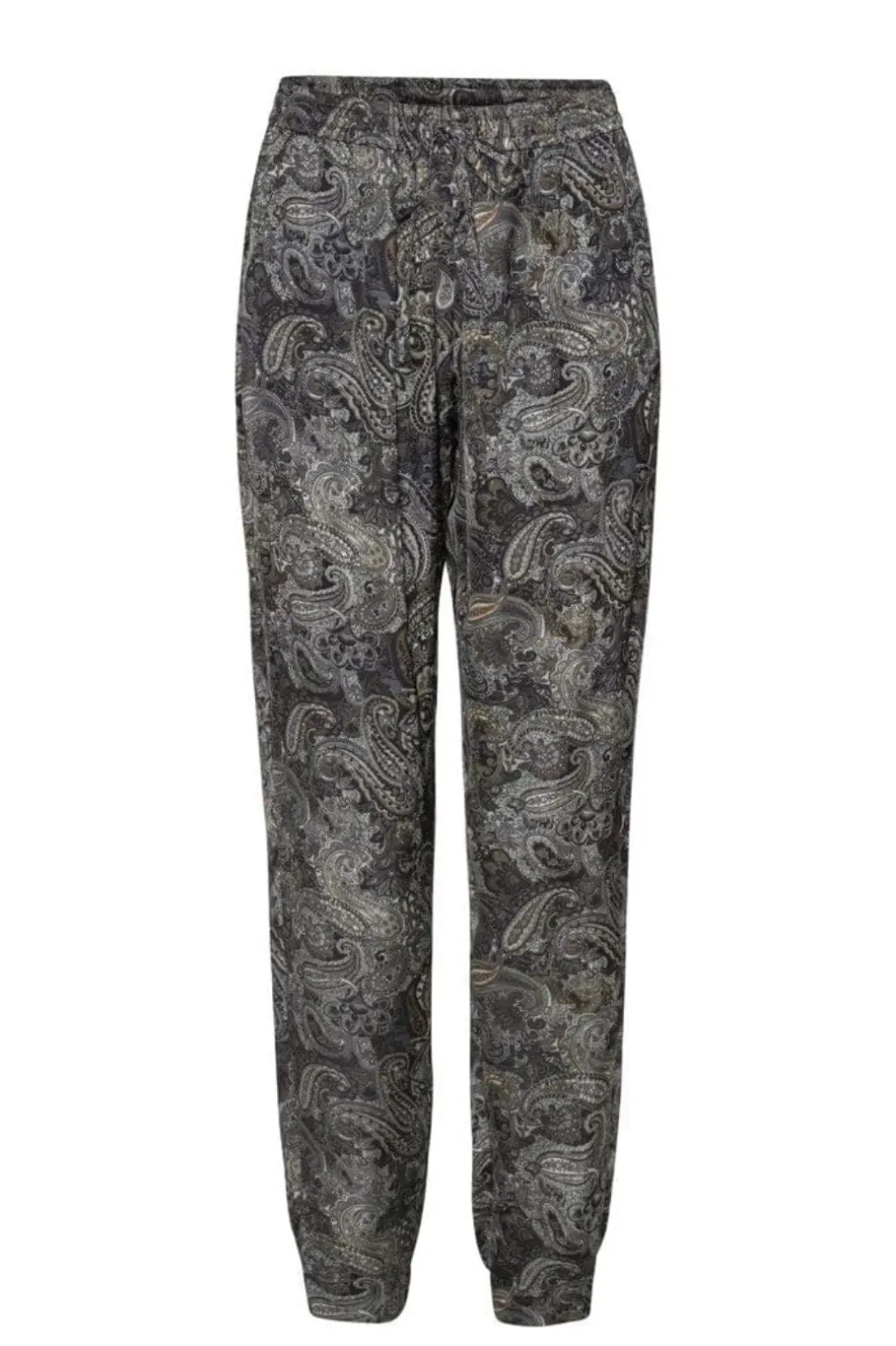 Bukser fra Karmamia med paisley-mønster i grå og sorte nuancer. Bukserne har en elastisk talje med snørelukning og går til anklen.