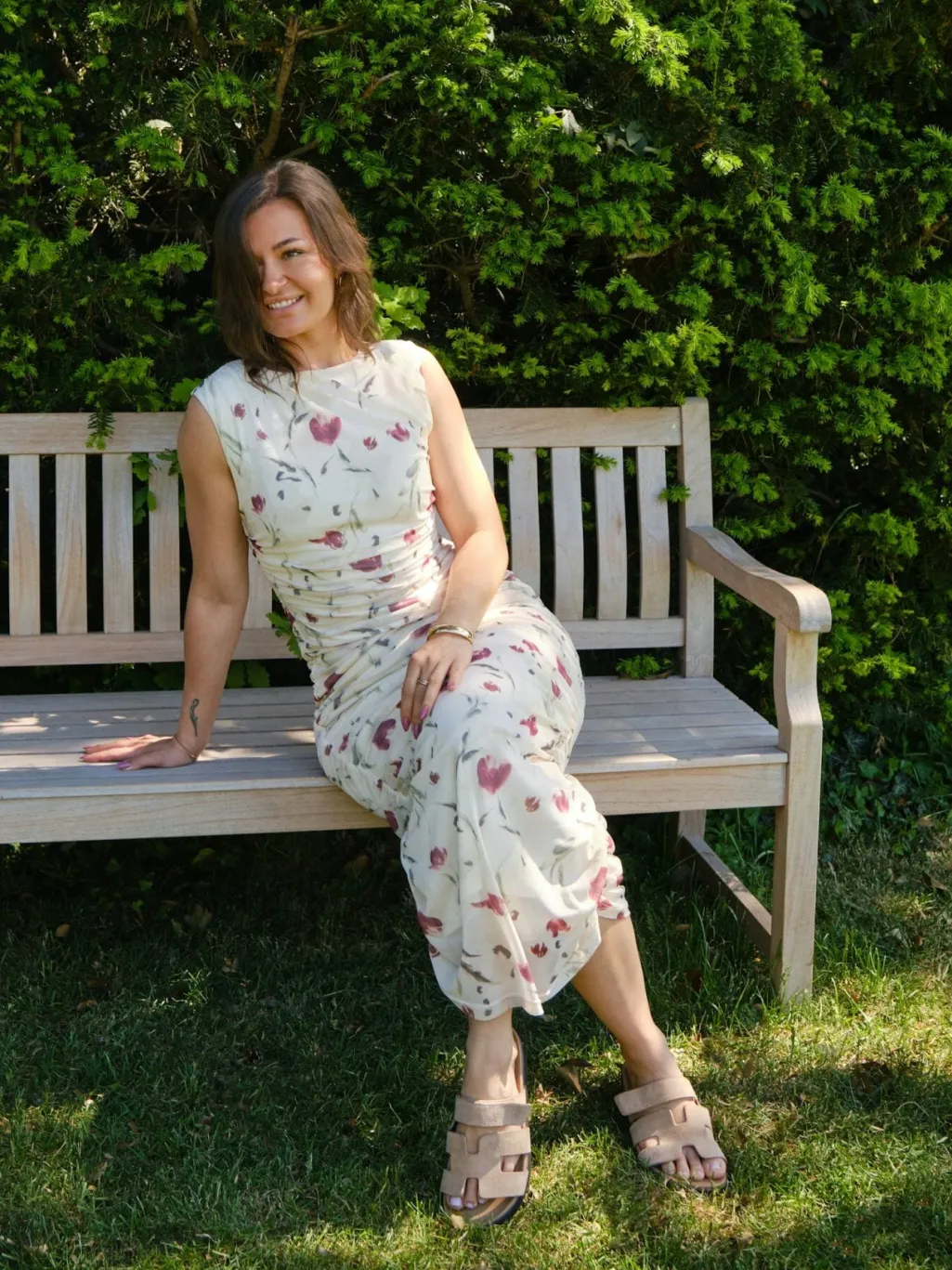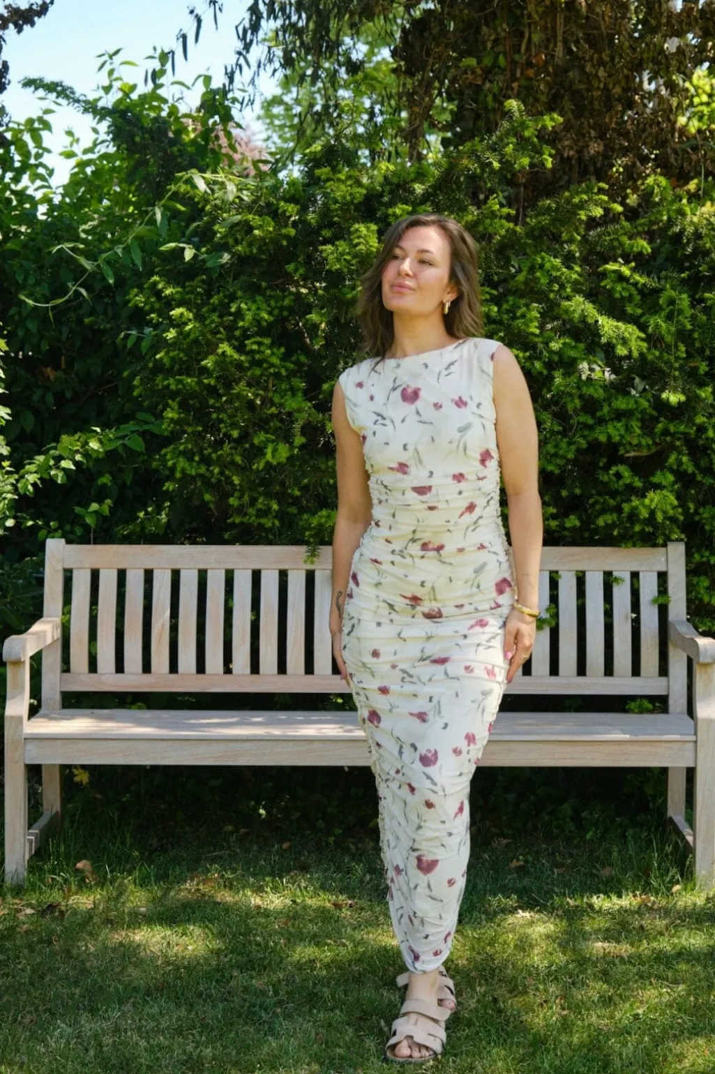 Cremefarvet meshkjole fra Neo Noir med pink blomsterprint. Kjolen har rynkdetaljer langs sidesømmen og er syet i et let og luftigt materiale med rund hals.