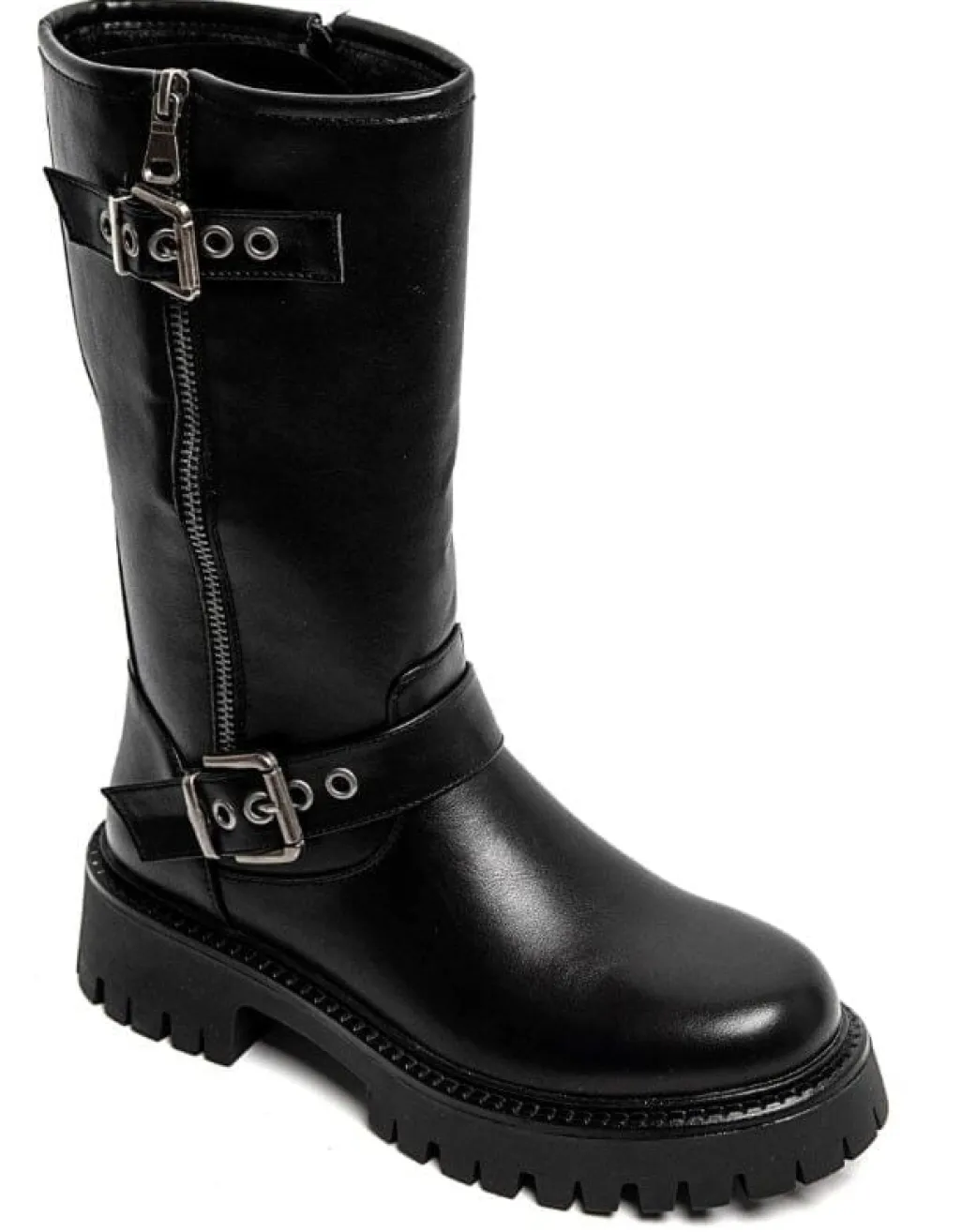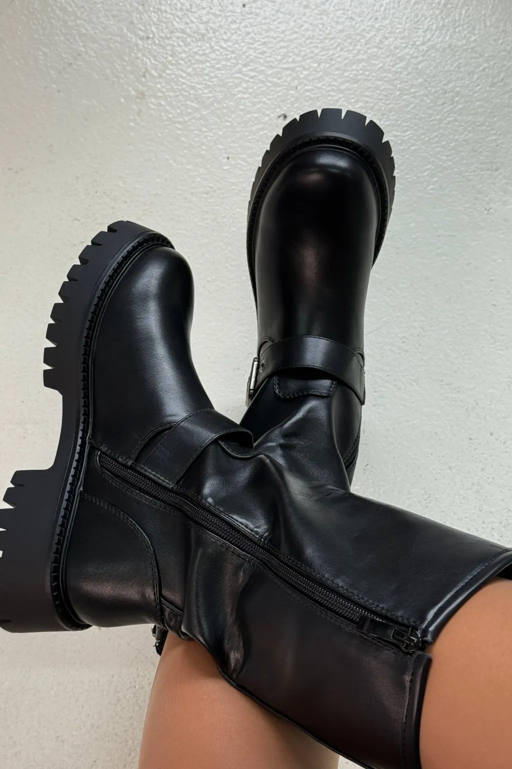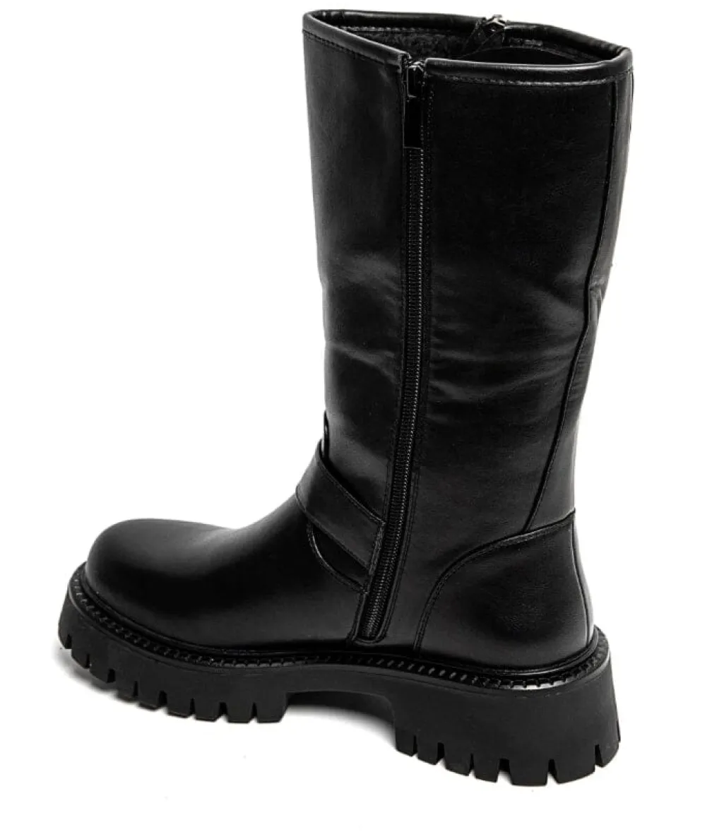 Sorte støvler fra Bloom, lavet af syntetisk materiale. Støvlerne har en kraftig sål, lynlås på siden og remme med spænder.