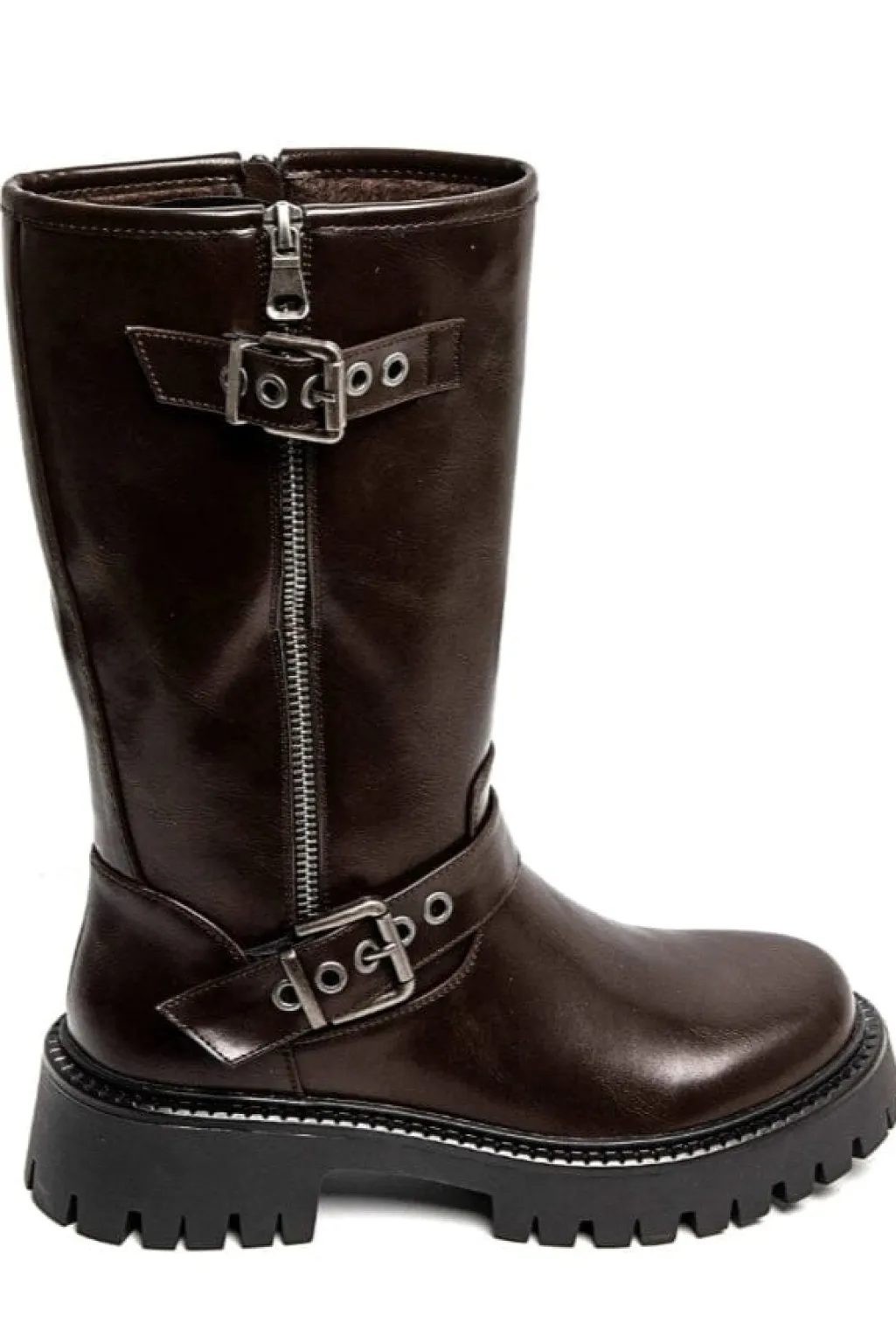 Støvler fra Bloom i mørkerød syntetisk materiale. Støvlerne har en rund tå og en blokhæl.
