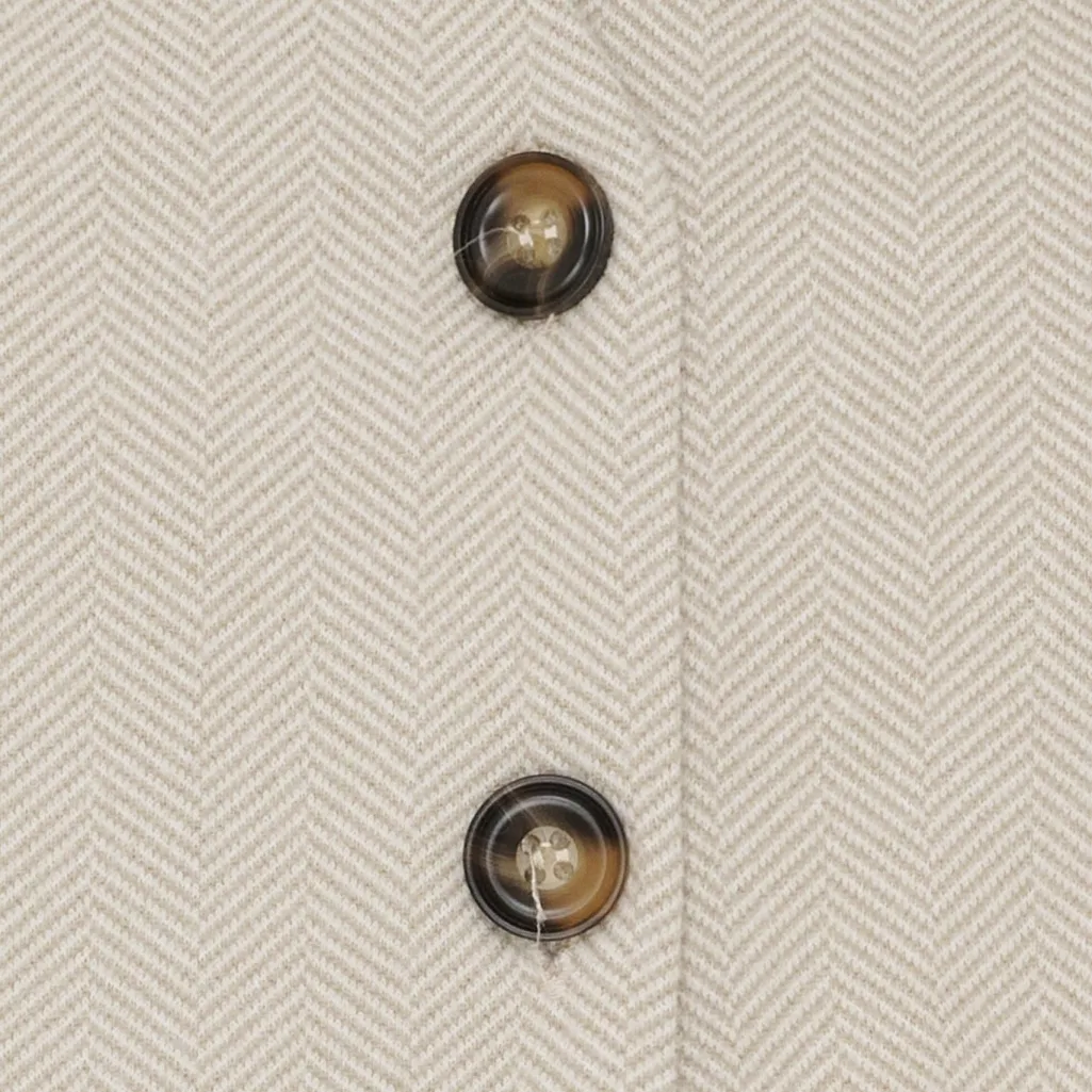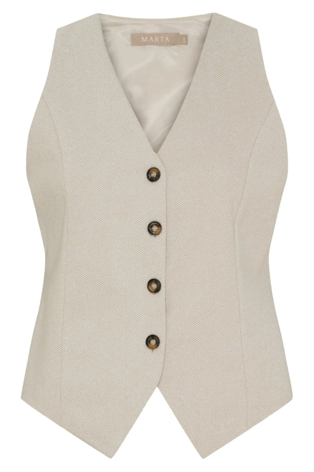 Beige vest fra Marta Du Chateau med fiskebensmønster. Den ærmeløse vest har en dyb V-udskæring og knapper foran.