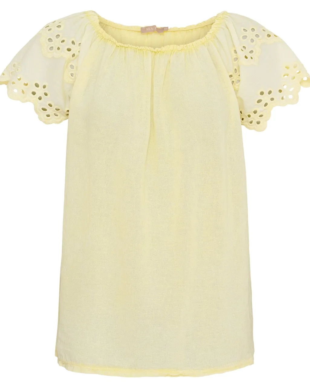 Gul bomuldsbluse fra Marta Du Chateau med off-shoulder design og broderede ærmer. Blusen har en løs pasform og korte ærmer med blomsterbroderi.