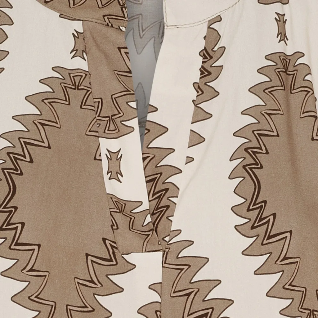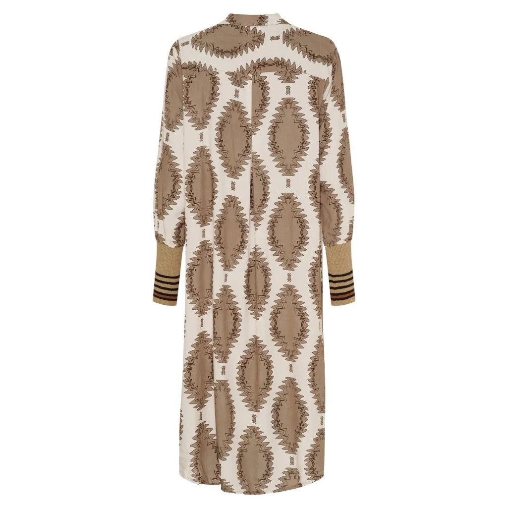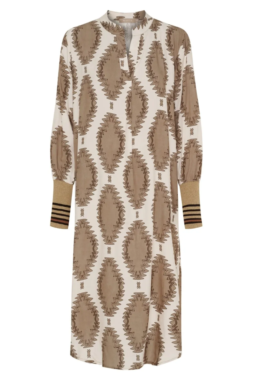 Flot kjole fra Marta Du Château i smart print. Skjorten har V-udskæring med en lille krave og ribkant ved ærmerne. Kan styles med både sneakers, sandaler eller et par støvler.- Ribkant ved ærmerne – Nem at style – V-udskæring Materiale: 100% viskose S/M: Bryst: 113 cm Længde: 117 cm L/XL: Bryst: 115 cm Længde: 118 cm