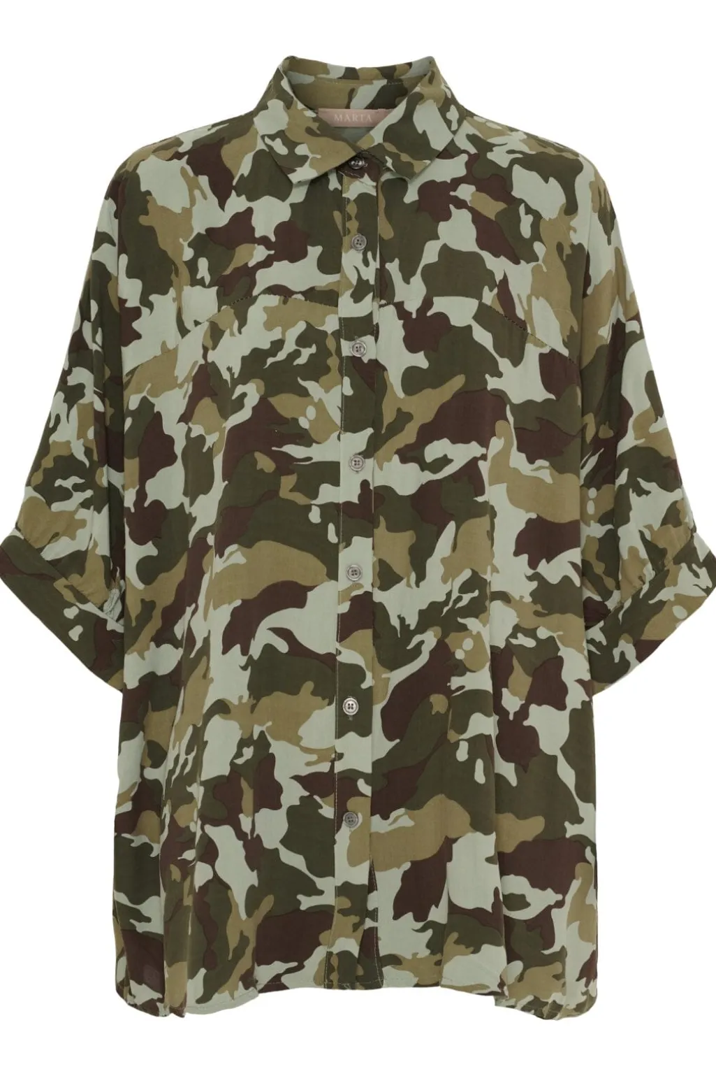 En skjorte fra Marta Du Chateau med camouflage-mønster i khaki grøn og grøn. Skjorten er lavet af 100 % viskose og har en oversized pasform.