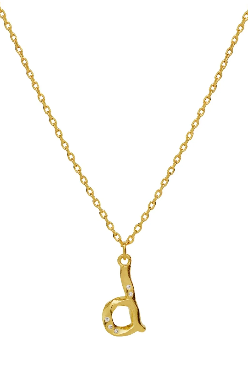 Gyldent halskæde fra Maanesten med D-bogstav som vedhæng. Smykket er lavet af genanvendt sterlingsølv med guldbelægning og har fine detaljer i designet.