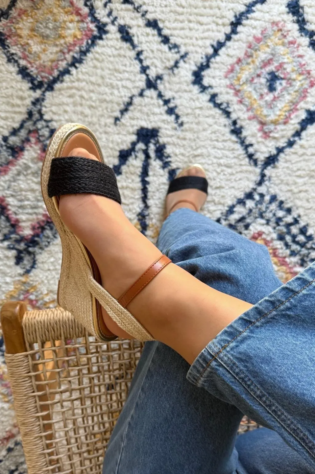 Sort sandal med kilehæl fra Bloom. Den har en åben tå og spænde-lukning ved anklen. Sandalen er fremstillet af syntetisk materiale med en brun ankelrem.