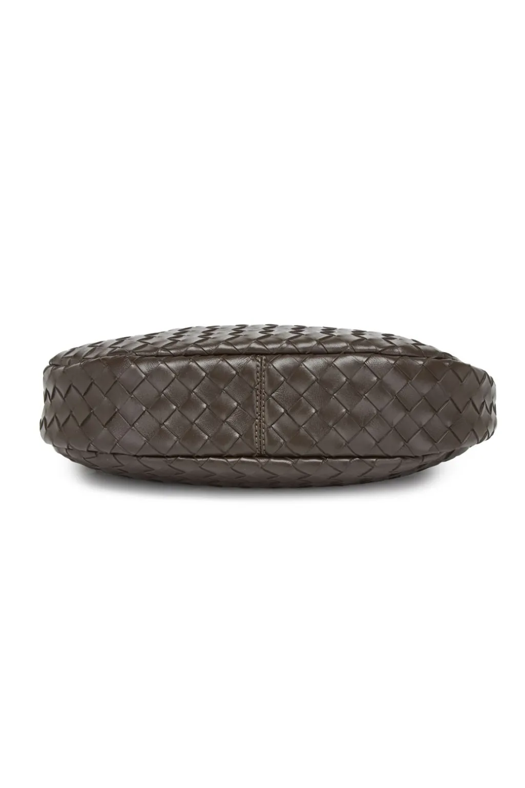 En skuldertaske fra Noella i mørkebrun med en flettet struktur på ydersiden. Tasken har en flad halvmåneform og detaljer i børstet sølv.