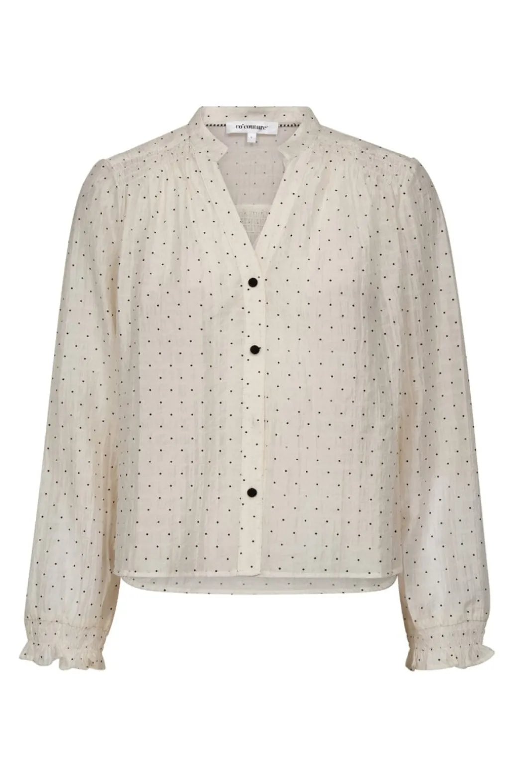 V-skjorte fra Co´Couture i off-white med små sorte prikker. Skjorten har lange ærmer med rynkede manchetter og en knaplukning foran.
