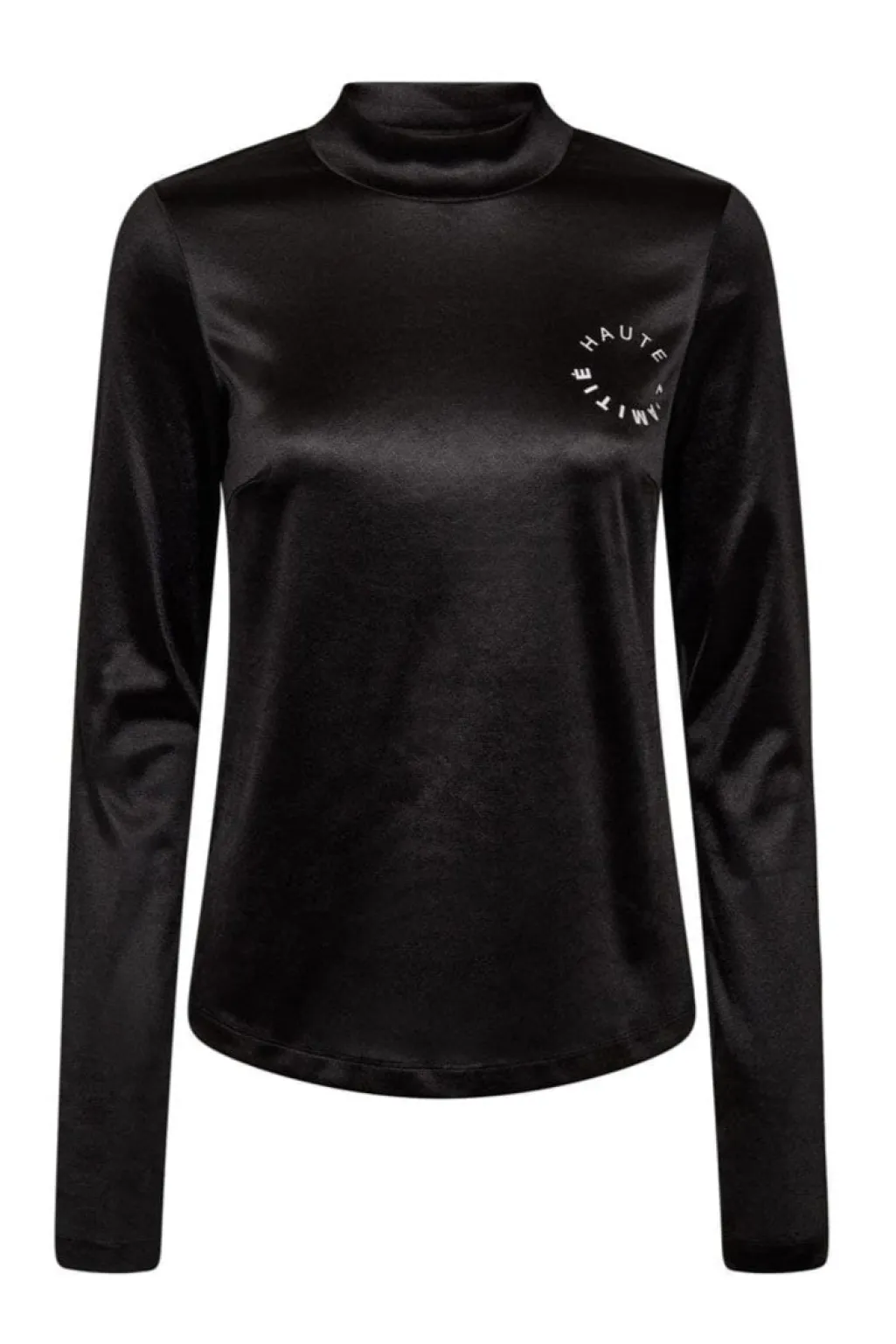 Sort bluse fra Haute L’Amitié med lange ærmer og høj hals. Blusen har en skinnende overflade og slim fit-pasform.