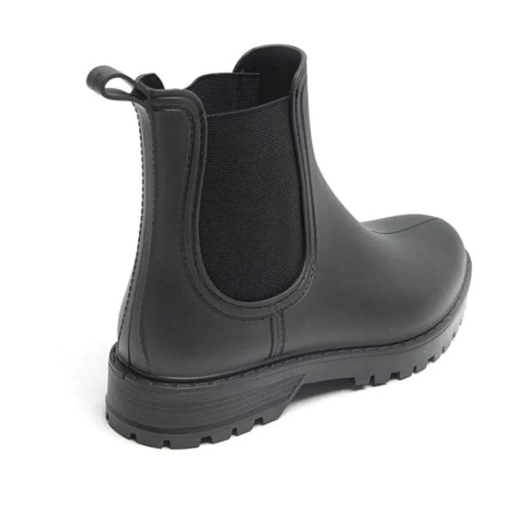 Sort regnstøvle fra Bloom med mat finish. Støvlen har elastiske sidepaneler, en kraftig skridsikker sål og en trækstrop bagpå.